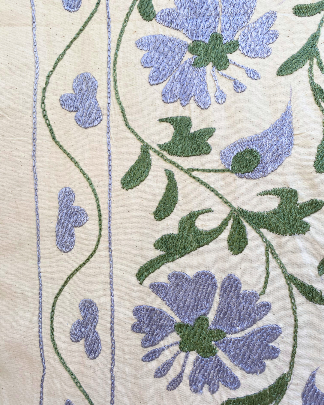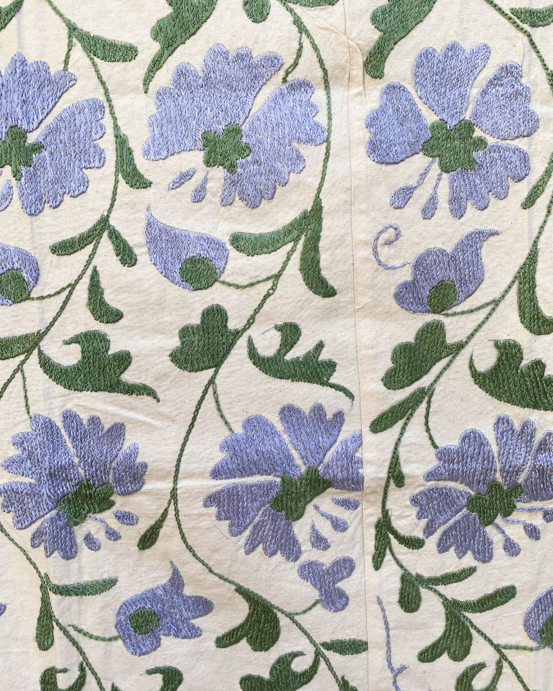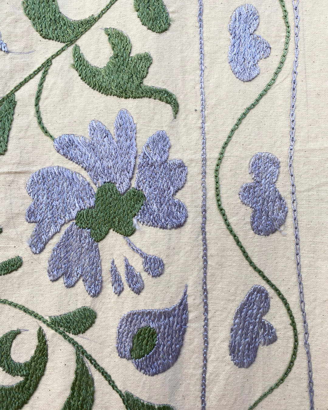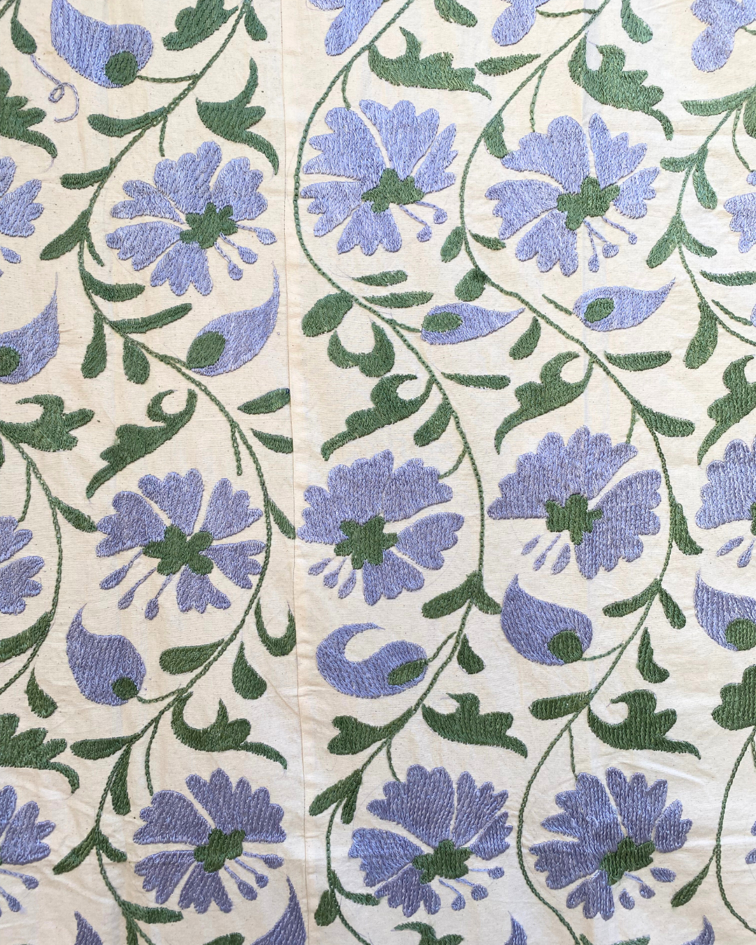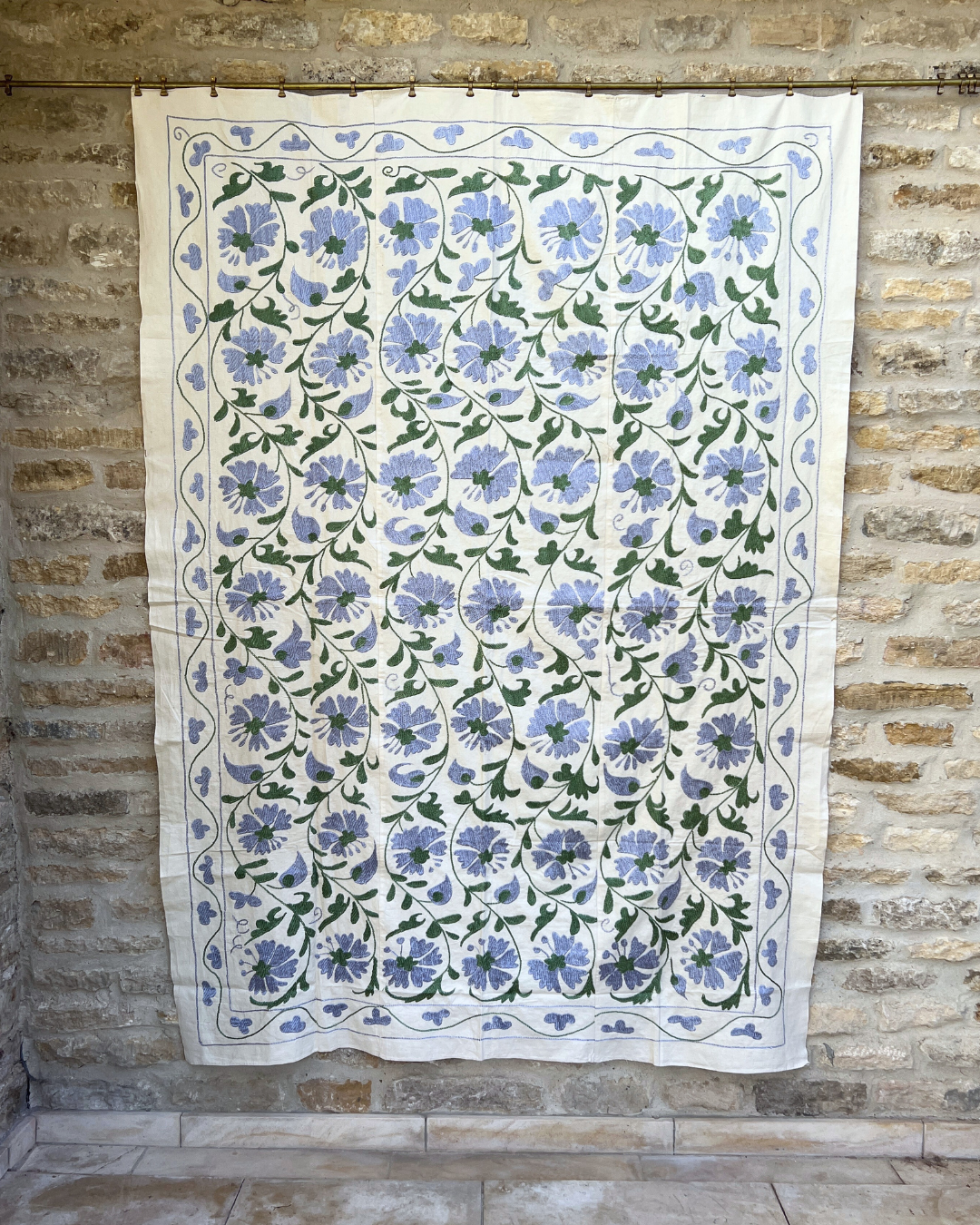 An exquisite hand-embroidered green and blue vintage textile panel, that has been chosen by Chloe from Asia. This handmade vintage Suzani, is a true masterpiece that will effortlessly infuse colour and pattern into any interior.