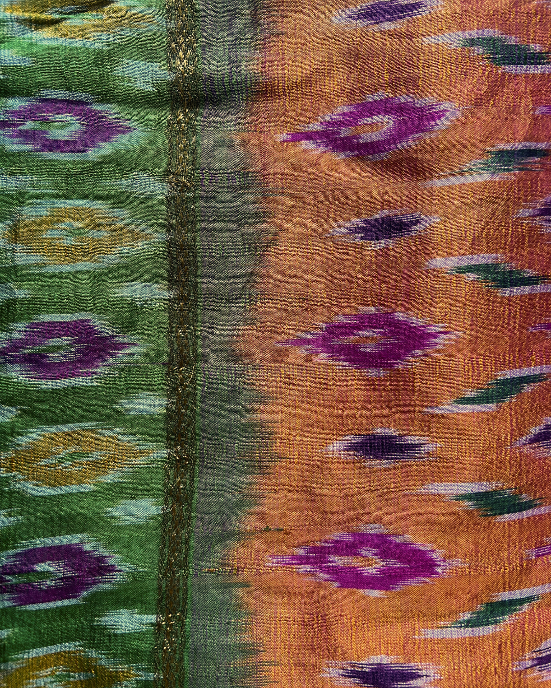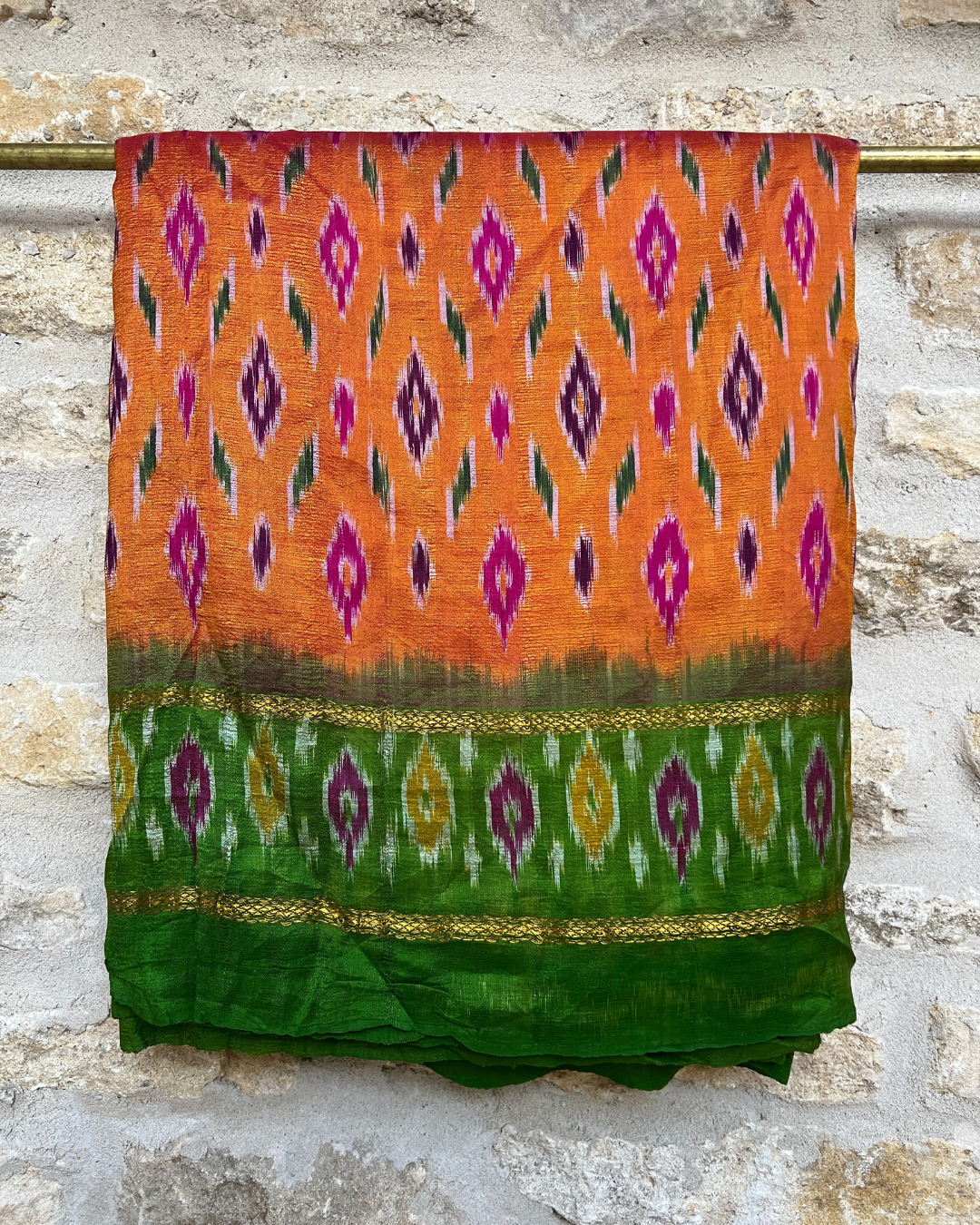 This orange, green and pink diamond style print Sari with floral trim trim has been hand picked with the utmost of care by Chloe from India and is made from 100% natural silk.
