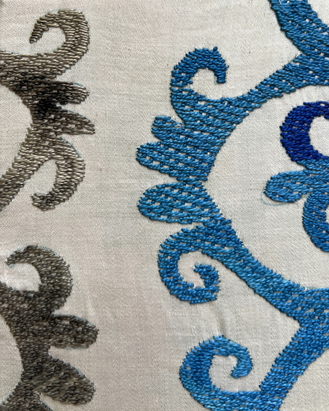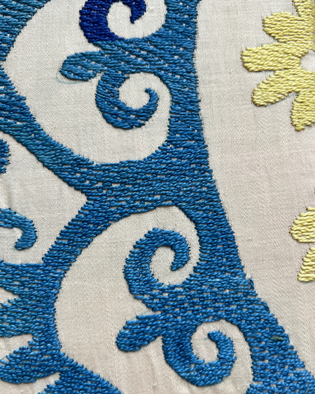 This suzani has been hand picked by Chloe and stretched onto a wooden frame by Chloe’s team to create a unique piece for your home.