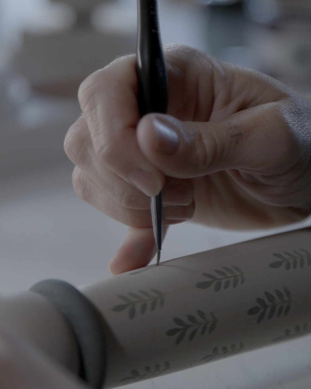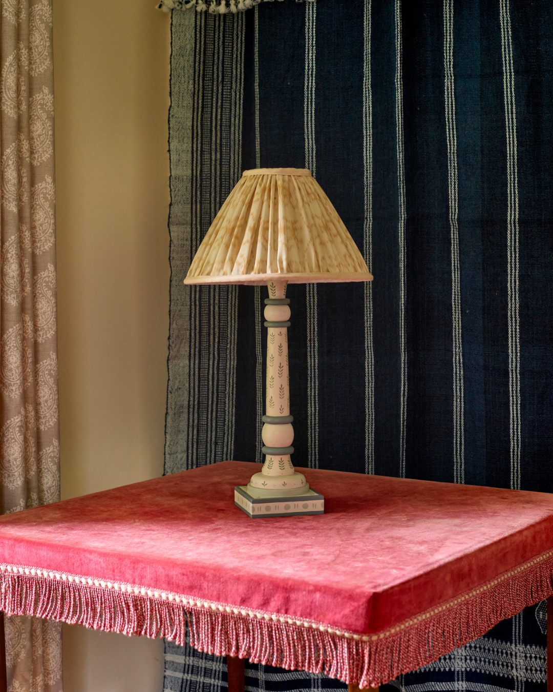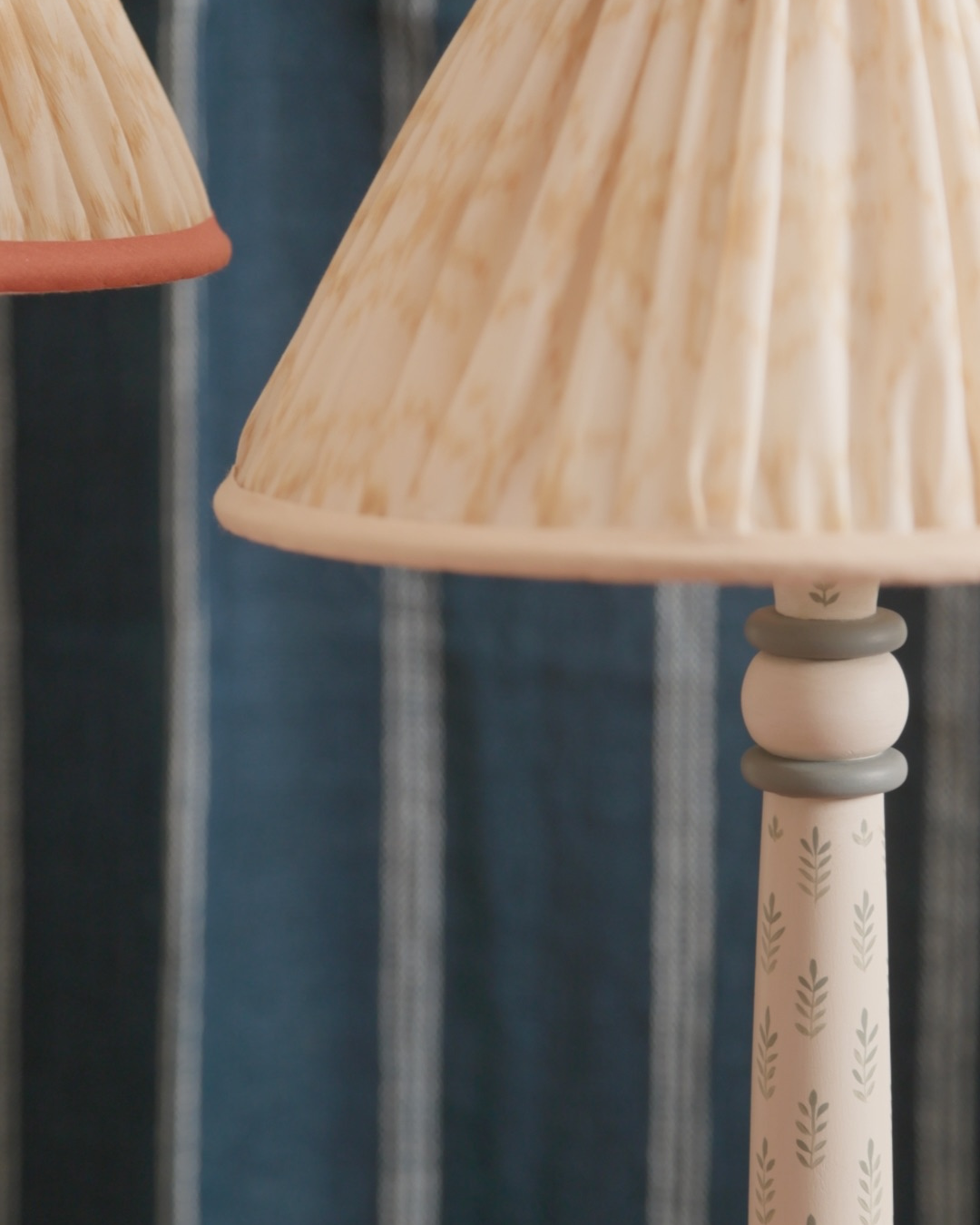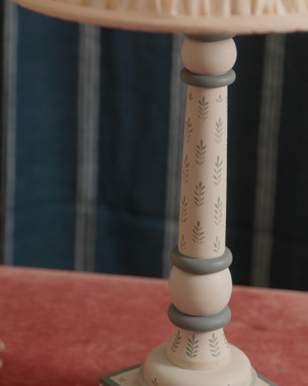 The green colourway combines a tones of delicate green and a warm neutral wash, hand painted on a turned wooden base featuring delicate leaf motifs and fine dot detailing. Inspired by the changing landscape of fields and woodlands, it pairs beautifully with the sari’s warm woven hues and coordinating trim.