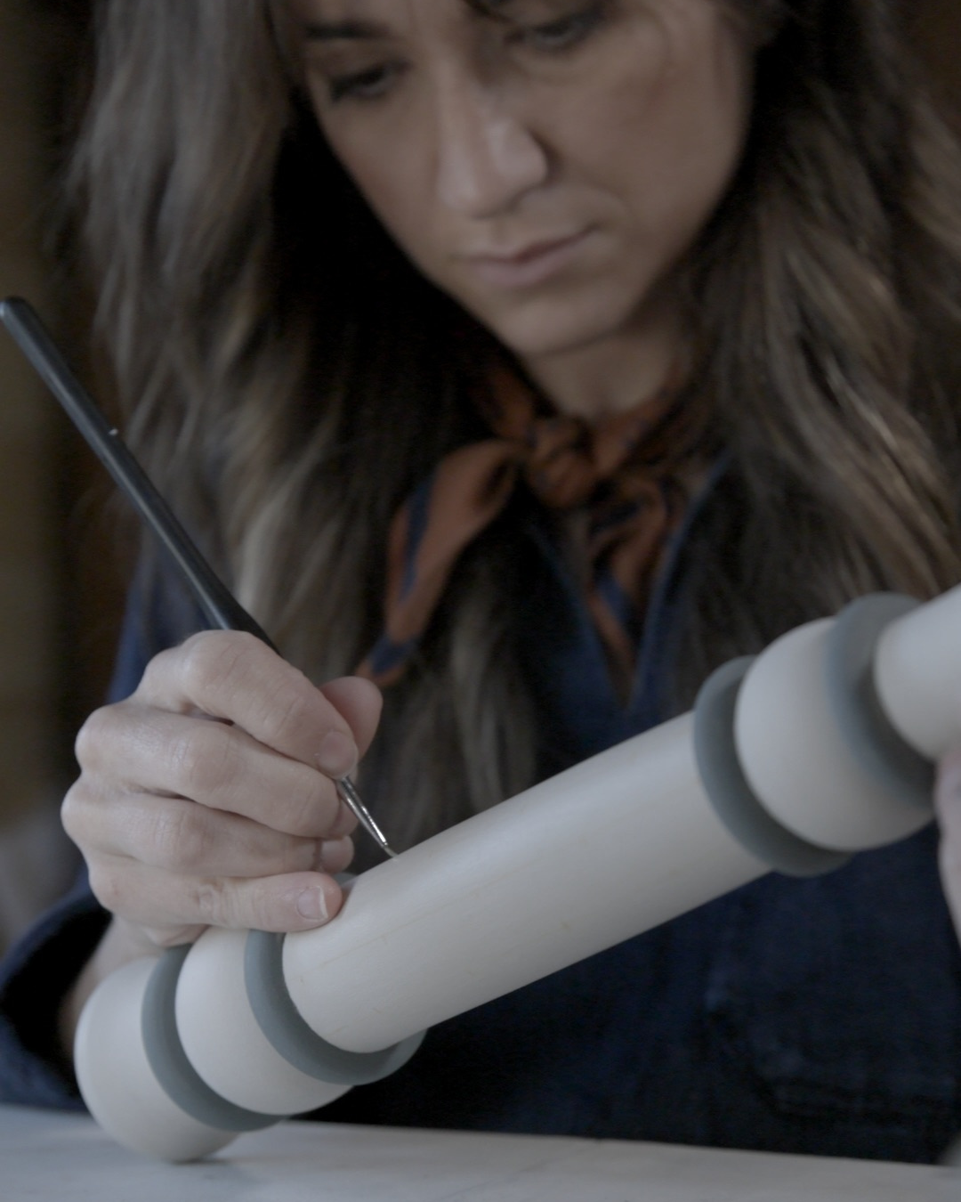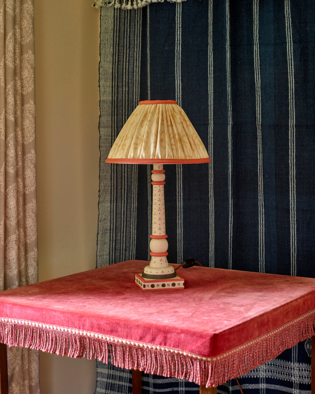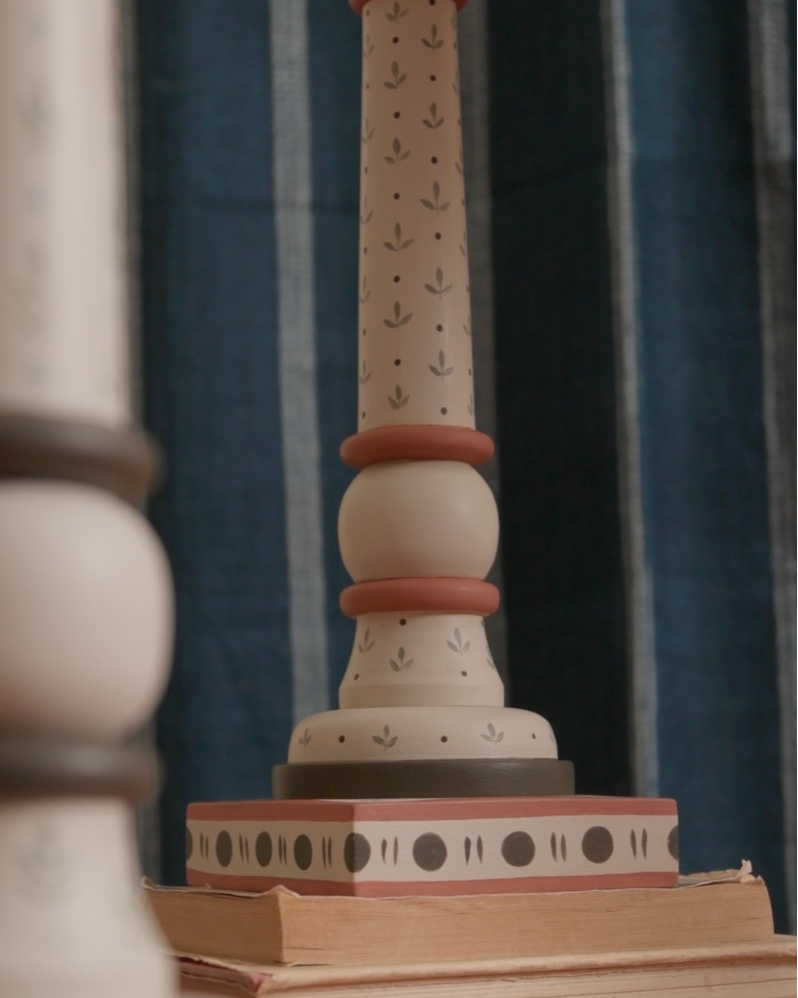 The earth colourway combines warm terracotta red, rich brown and a warm neutral wash, hand painted on a turned wooden base featuring delicate leaf motifs and fine dot detailing. Inspired by the earthy fire of old terracotta tiles, it pairs beautifully with the sari’s warm woven hues and coordinating trim.