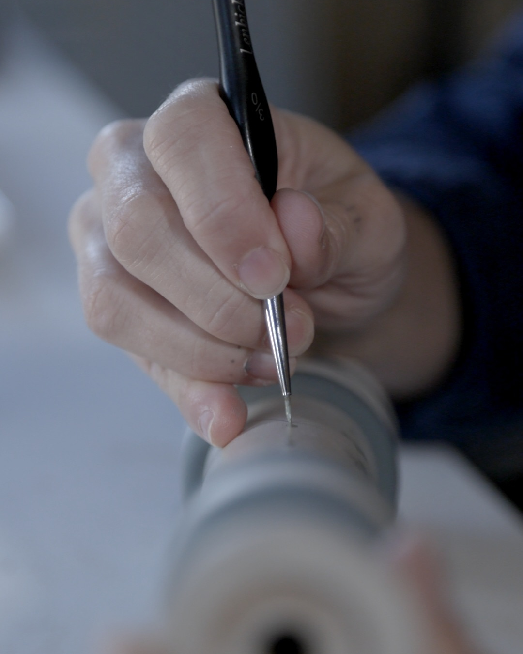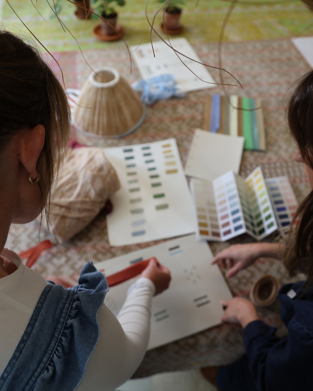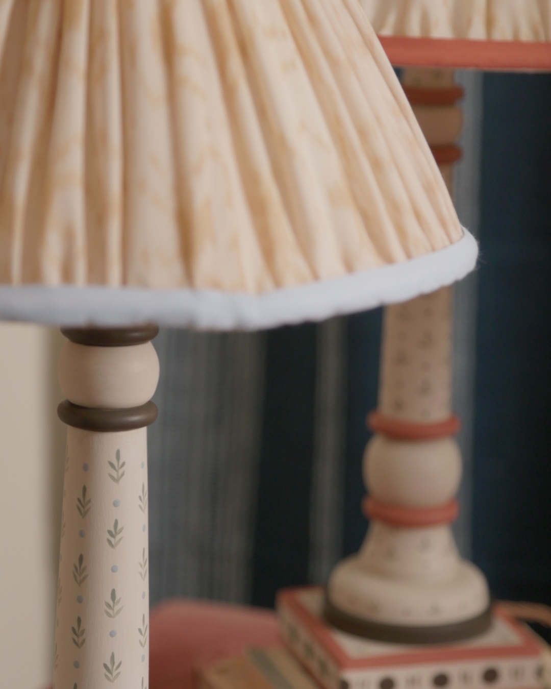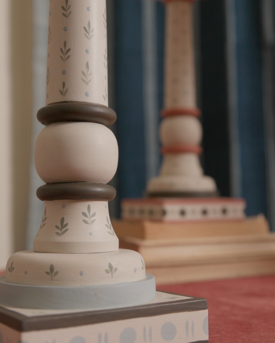 The blue colourway combines a muted blue, rich brown and a warm neutral wash, hand painted on a turned wooden base featuring delicate leaf motifs and fine dot detailing. Inspired by the soil and sky, it pairs beautifully with the sari’s warm woven hues and coordinating trim.