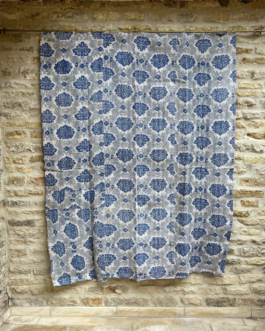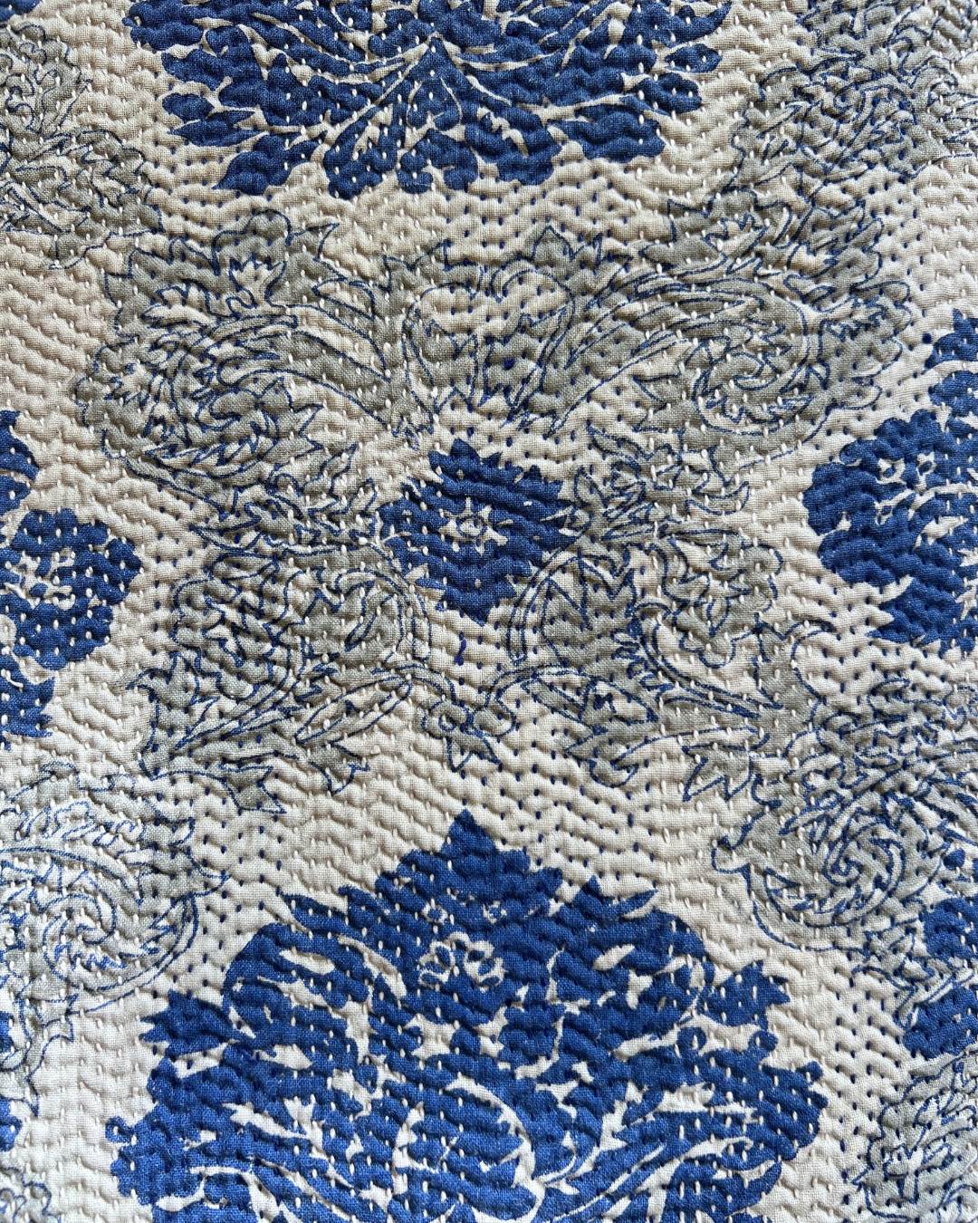 This one of a kind blue, cream and green baroque print kantha quilt, has been hand-picked by Chloe from India, ensuring the highest quality and authenticity. This delicious heavyweight vintage kantha quilt is crafted from numerous layers of vintage cotton saris all meticulously hand-sewn together.