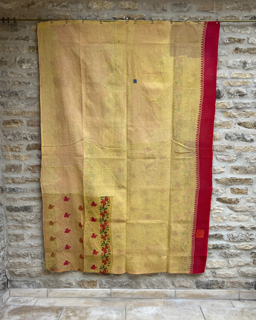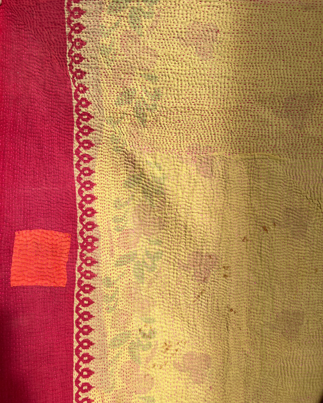 This one of a kind vintage kantha quilt, with a floral and traditional print. The quilt has been hand-picked by Chloe from India, ensuring the highest quality and authenticity. This delicious lightweight vintage kantha quilt is crafted from numerous layers of vintage cotton saris all meticulously hand-sewn together.
