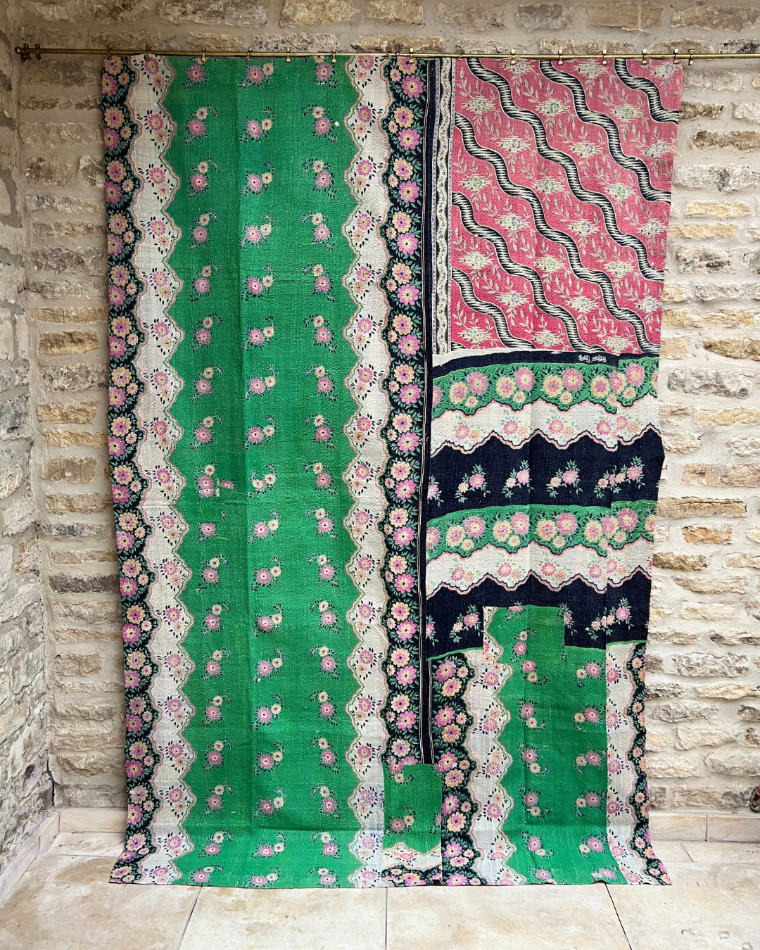 This one of a kind green, navy and pink quilt has been hand-picked by Chloe from India, ensuring the highest quality and authenticity. This delicious midweight vintage kantha quilt is crafted from numerous layers of vintage cotton saris all meticulously hand-sewn together.