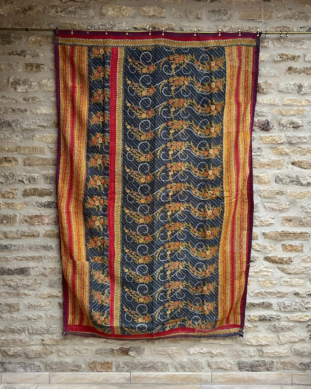 This one of a kind blue, red and yellow quilt has been hand-picked by Chloe from India, ensuring the highest quality and authenticity. This delicious midweight vintage kantha quilt is crafted from numerous layers of vintage cotton saris all meticulously hand-sewn together.