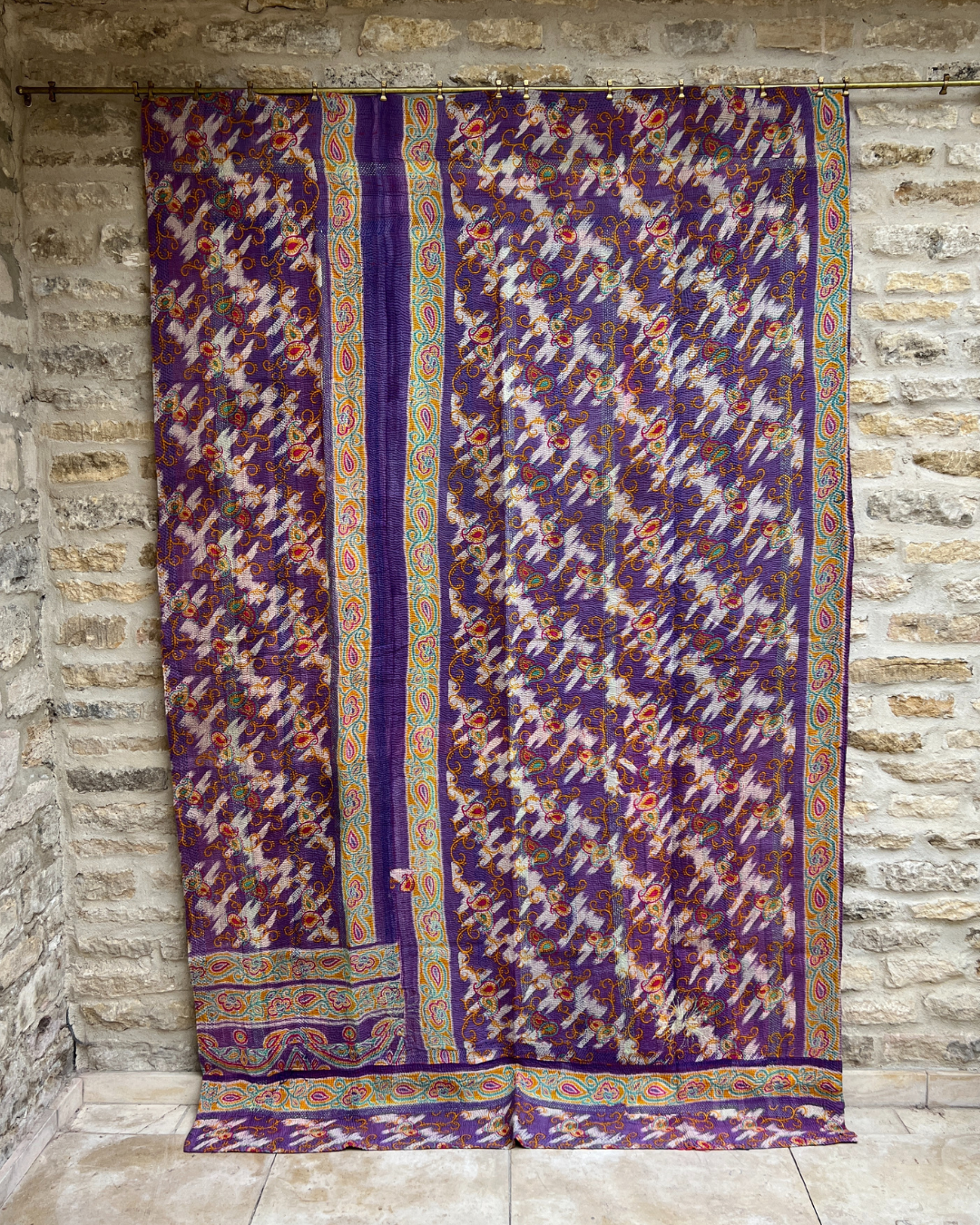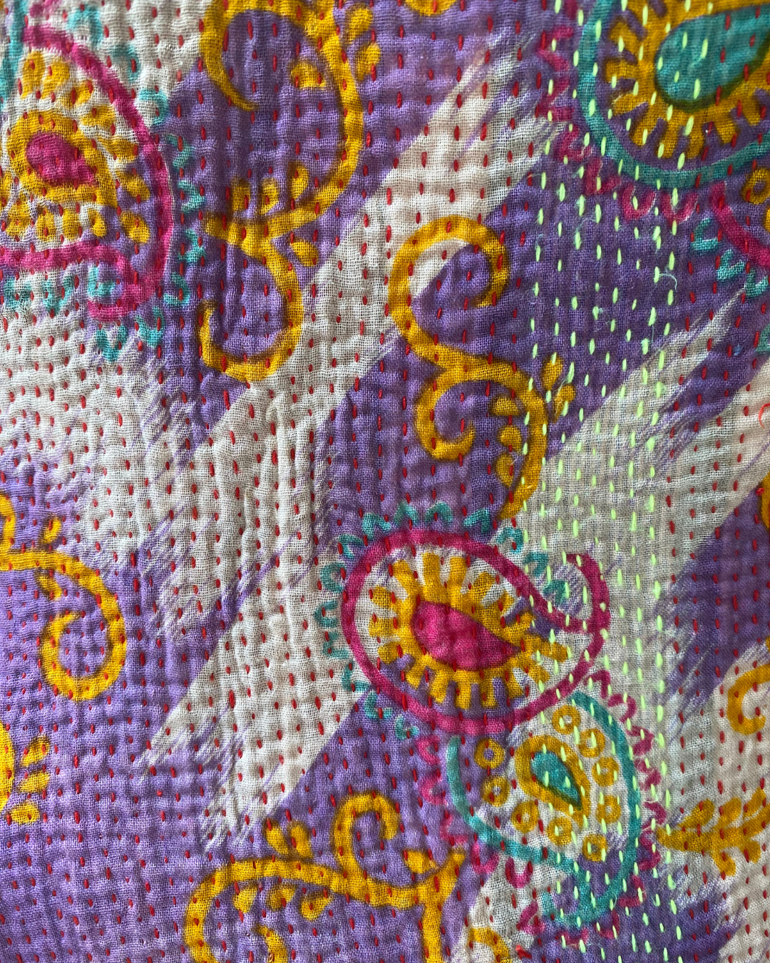 This one of a kind purple, yellow and pink quilt has been hand-picked by Chloe from India, ensuring the highest quality and authenticity. This delicious midweight vintage kantha quilt is crafted from numerous layers of vintage cotton saris all meticulously hand-sewn together.