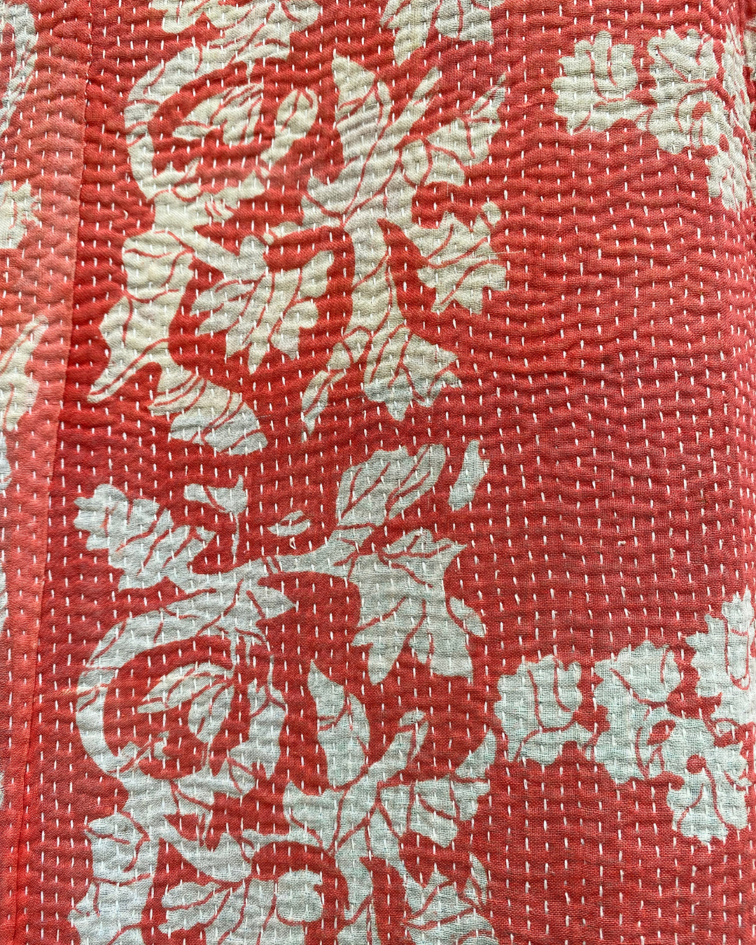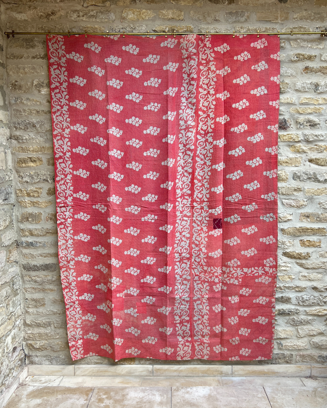 This one of a kind coral, white and rainbow quilt has been hand-picked by Chloe from India, ensuring the highest quality and authenticity. This delicious midweight vintage kantha quilt is crafted from numerous layers of vintage cotton saris all meticulously hand-sewn together.