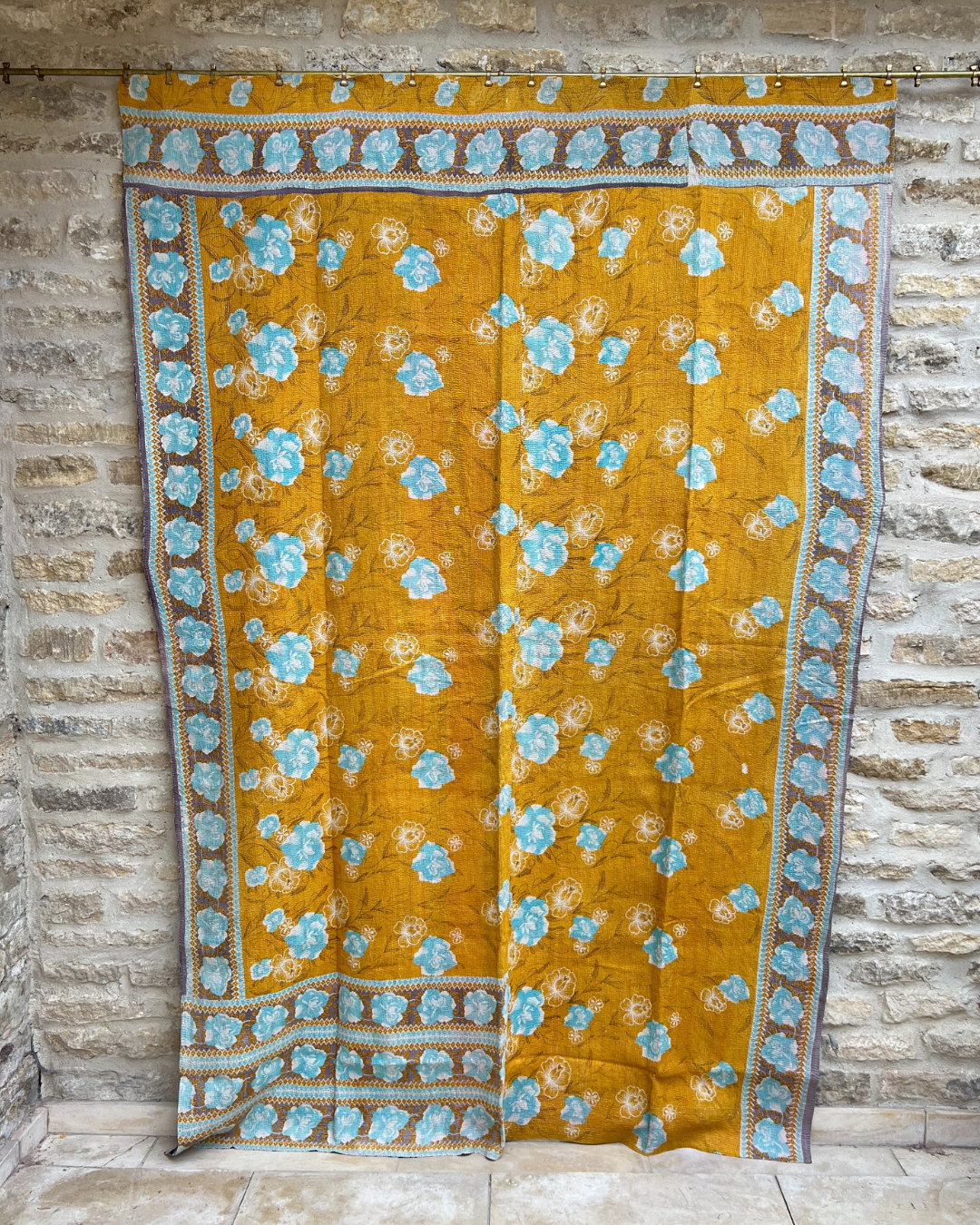 This one of a kind yellow, blue and red quilt has been hand-picked by Chloe from India, ensuring the highest quality and authenticity. This delicious midweight vintage kantha quilt is crafted from numerous layers of vintage cotton saris all meticulously hand-sewn together.