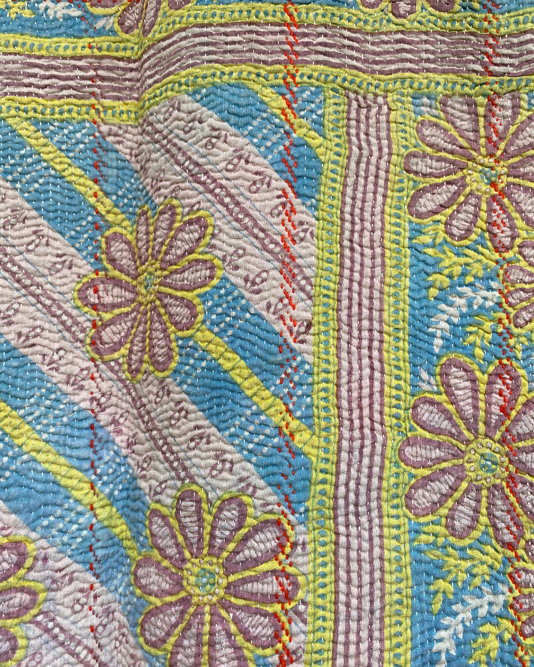 This one of a kind lilac, blue and yellow quilt has been hand-picked by Chloe from India, ensuring the highest quality and authenticity. This delicious midweight vintage kantha quilt is crafted from numerous layers of vintage cotton saris all meticulously hand-sewn together.