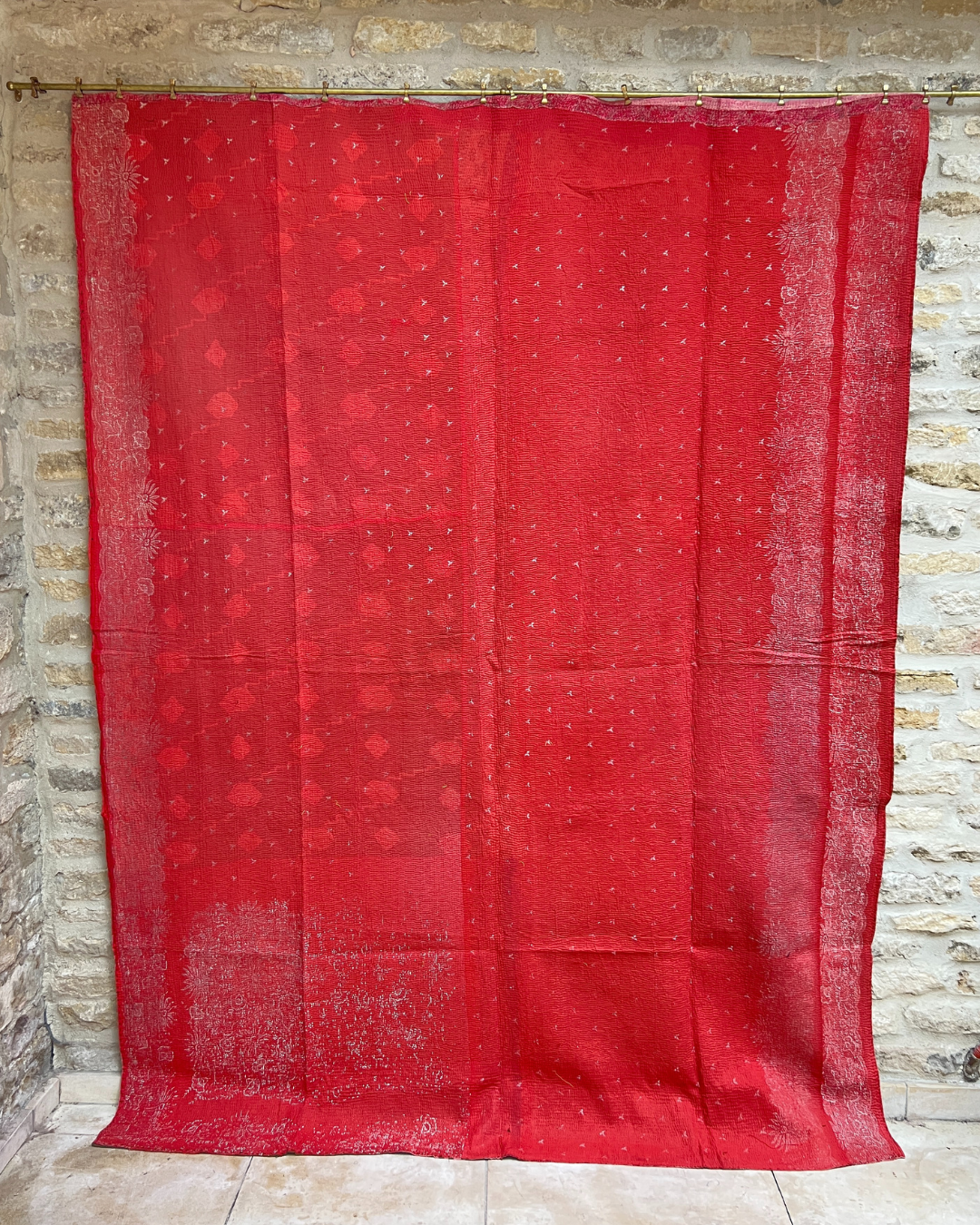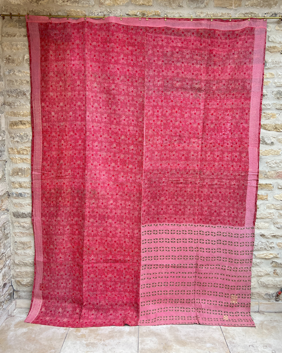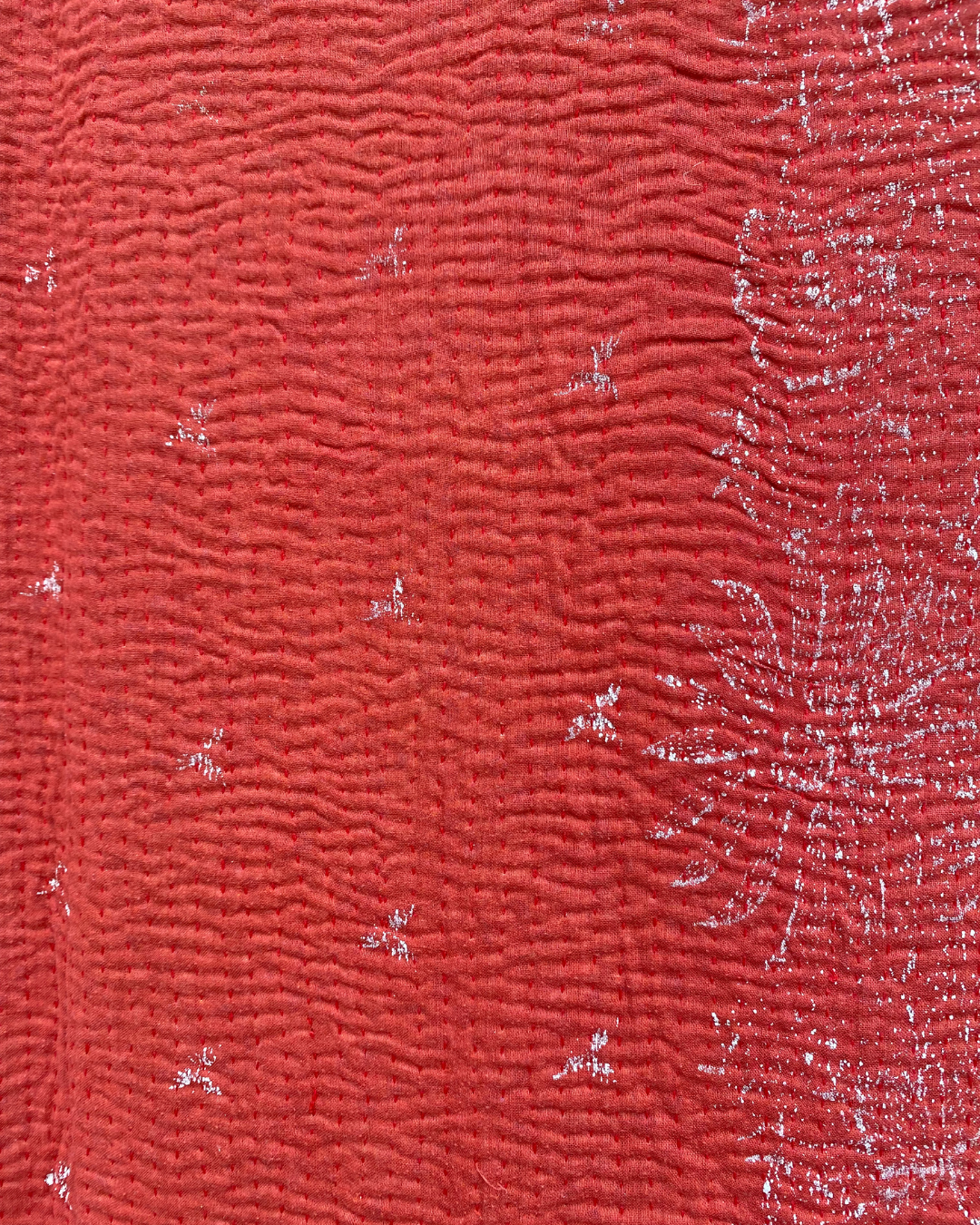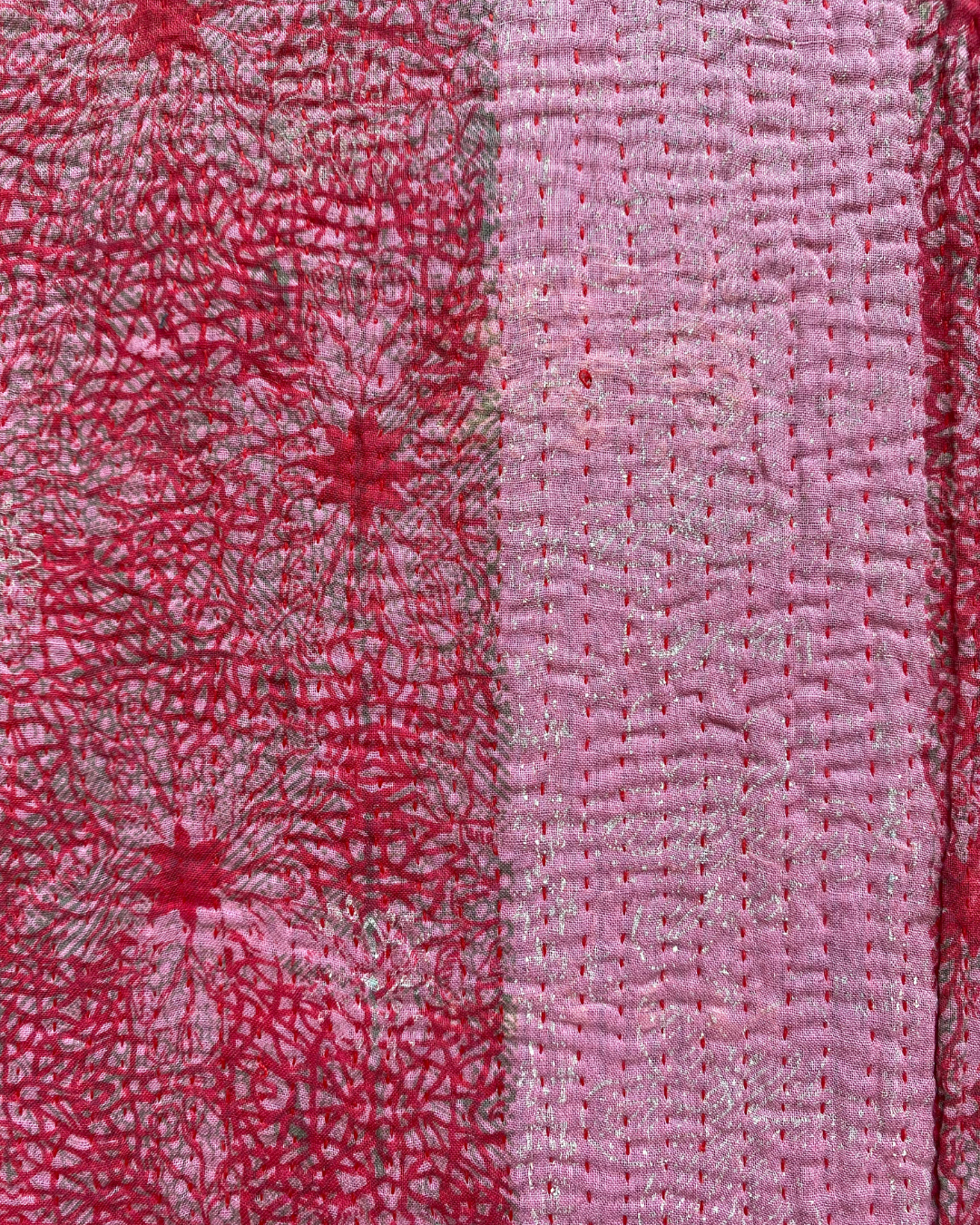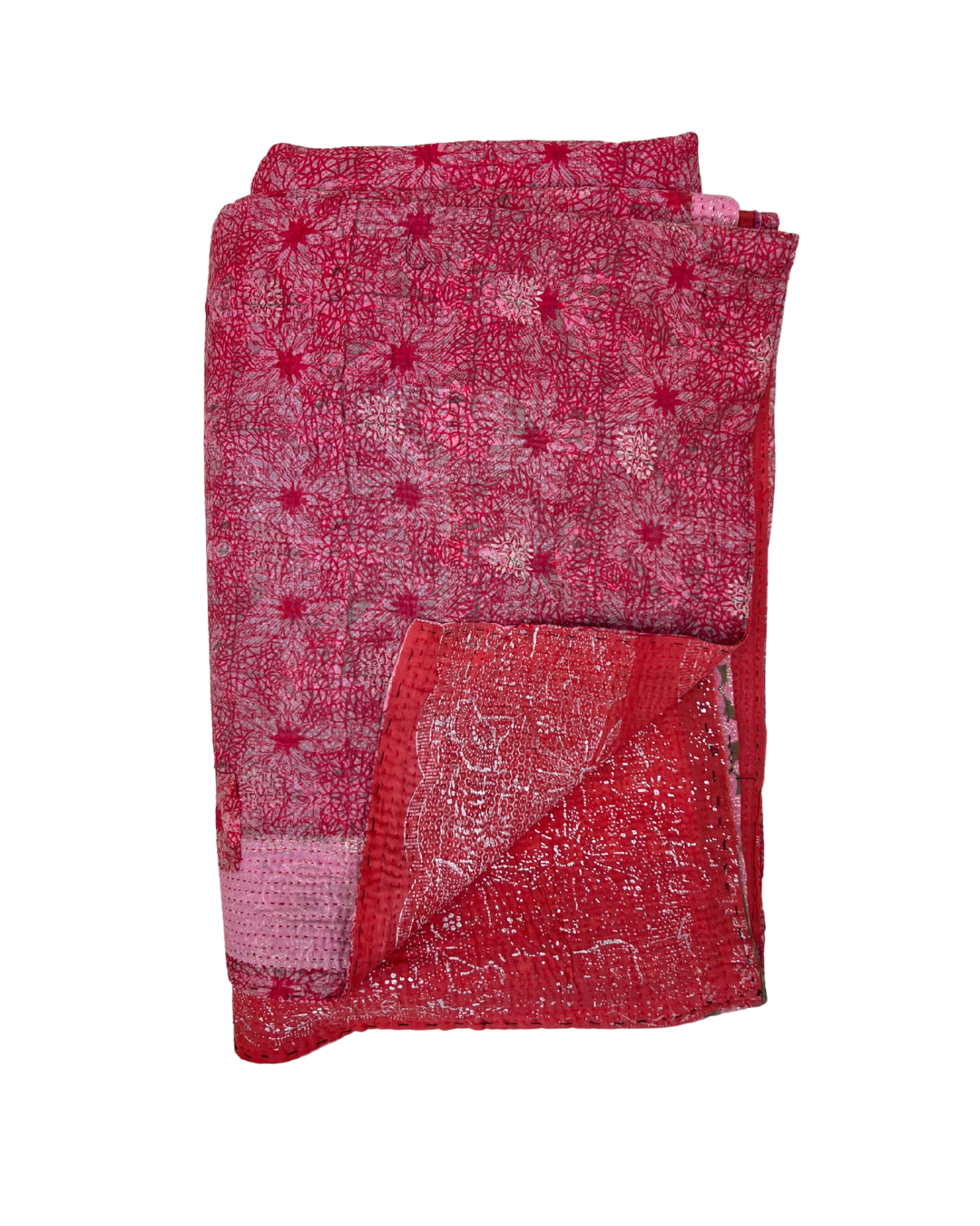 This one of a kind red, pink and green quilt has been hand-picked by Chloe from India, ensuring the highest quality and authenticity. This delicious midweight vintage kantha quilt is crafted from numerous layers of vintage cotton saris all meticulously hand-sewn together.