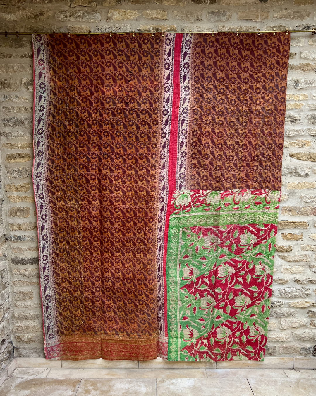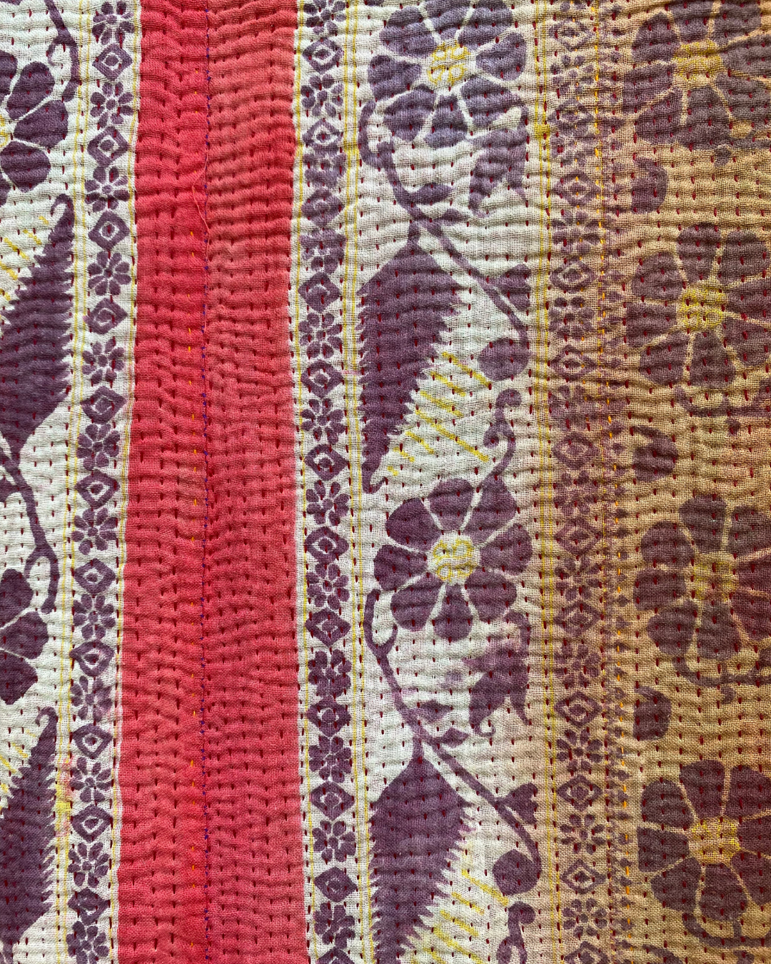 This one of a kind yellow, red and orange quilt has been hand-picked by Chloe from India, ensuring the highest quality and authenticity. This delicious midweight vintage kantha quilt is crafted from numerous layers of vintage cotton saris all meticulously hand-sewn together.