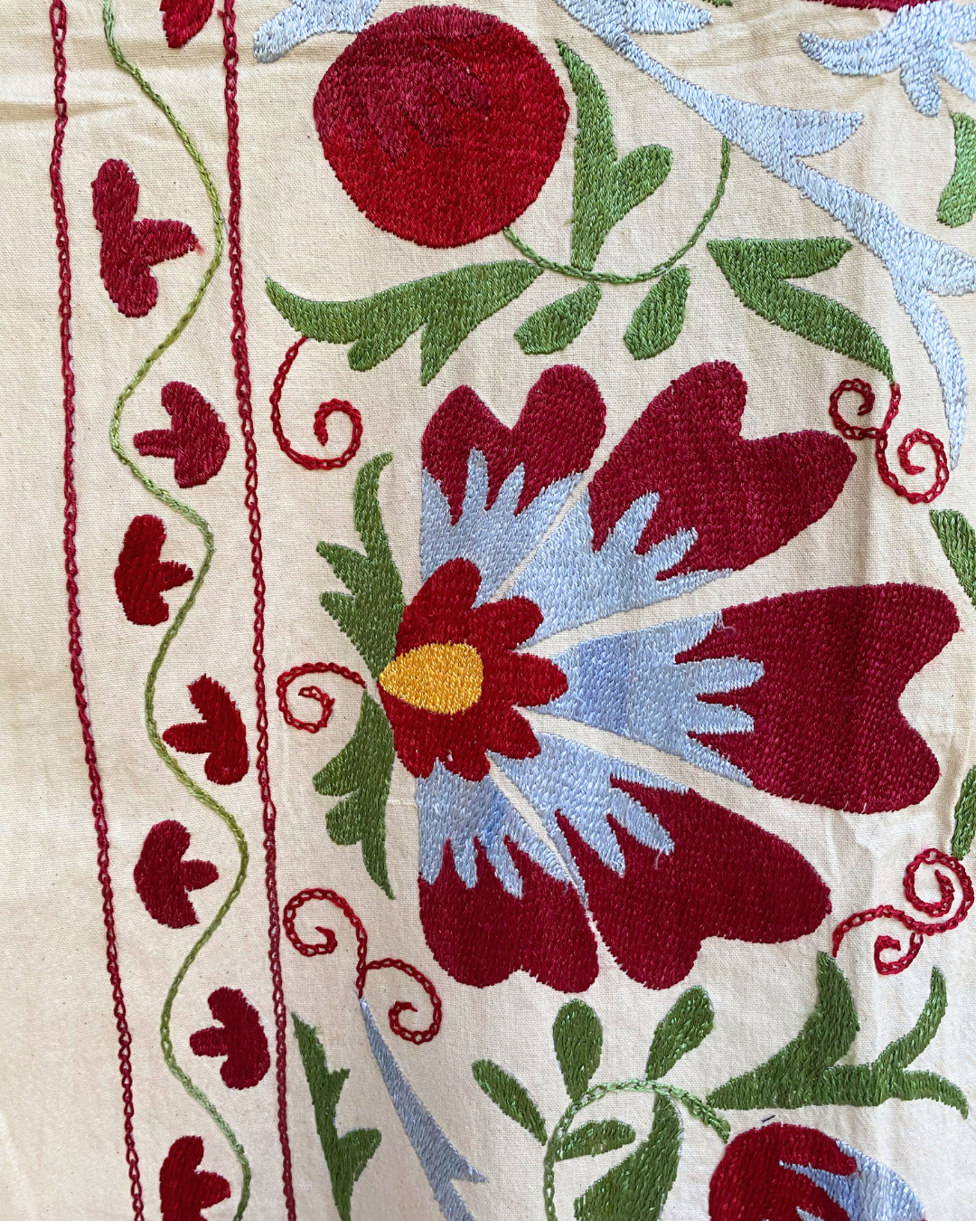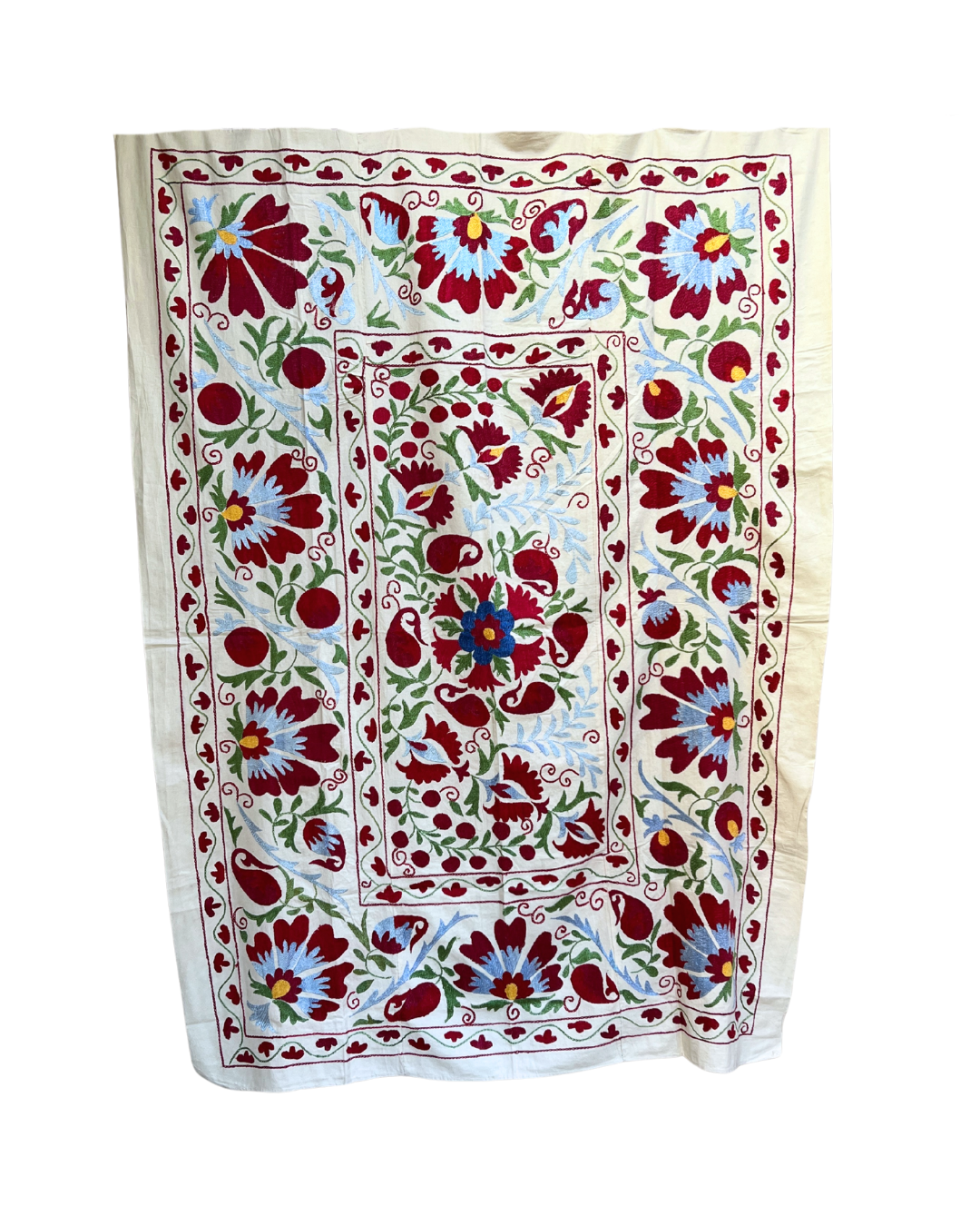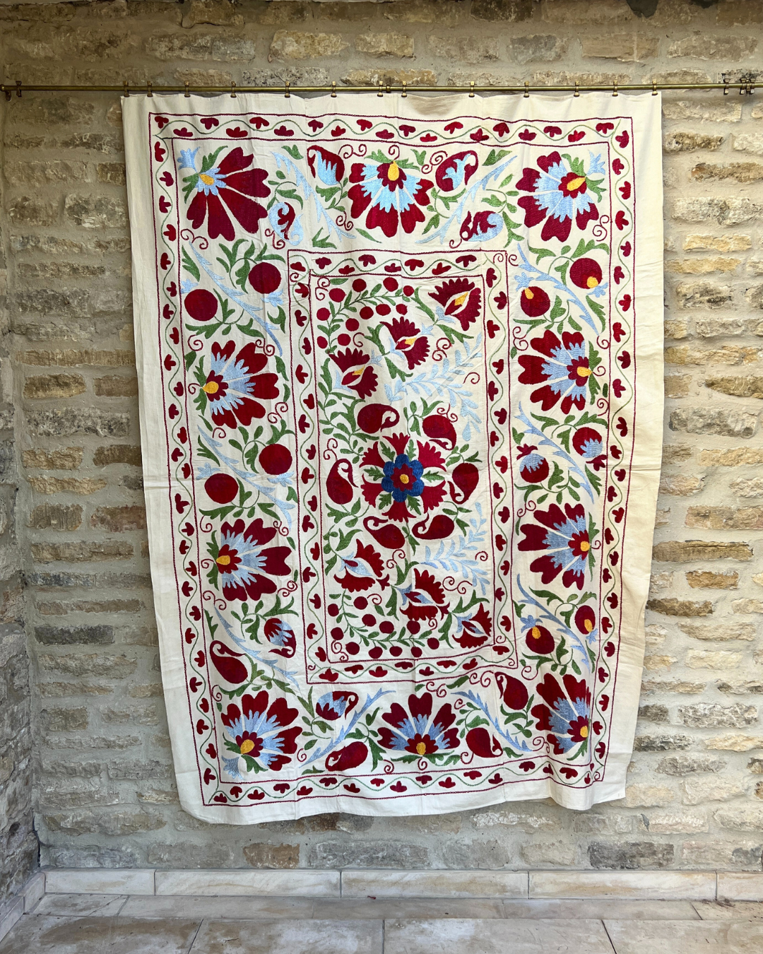 This Suzani has a rich history that is believed to be over 20 years, it is likely to carry endearing marks of time, such imperfections only enhance its unique character and add to its charm.