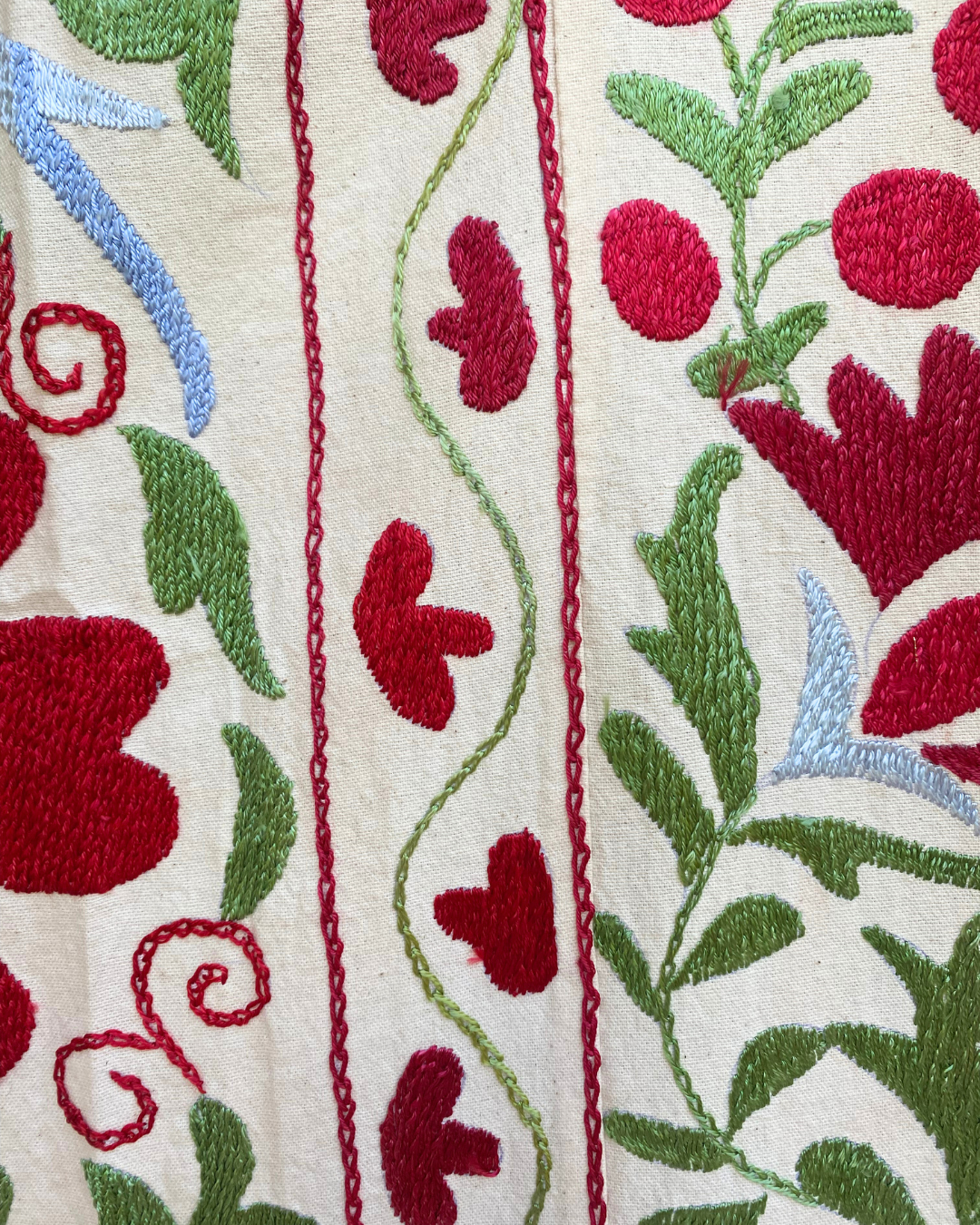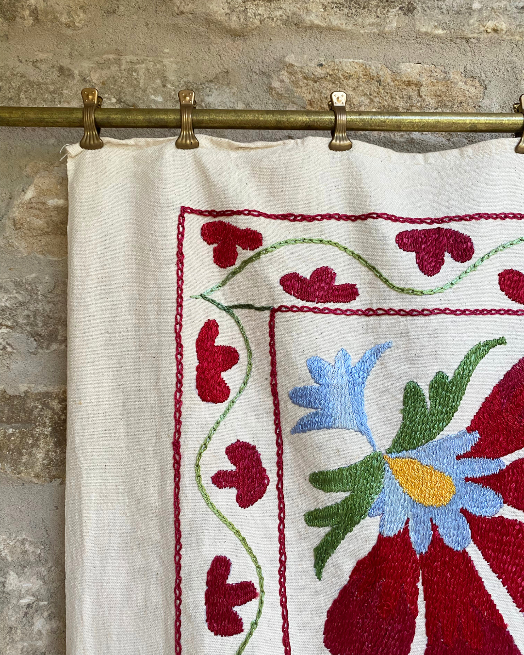 An exquisite hand-embroidered red, green and light blue vintage textile panel, that has been chosen by Chloe from Asia. This handmade vintage Suzani, is a true masterpiece that will effortlessly infuse colour and pattern into any interior.