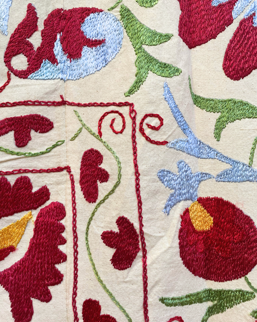 The beautiful colour palette and delicate patterns tell a story all of their own, working well in traditional as well as more contemporary settings. Use this panel to transform a headboard or ottoman, or gracefully drape it over a sofa or bed. This magnificent Suzani is an absolute treasure perfectly combining timeless beauty and unrivalled artistry.