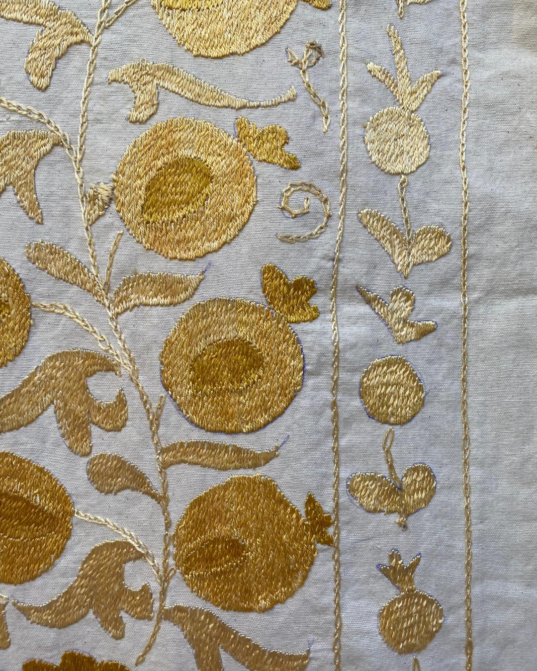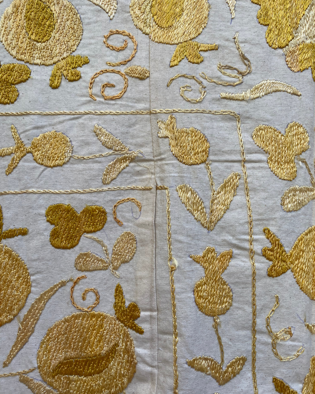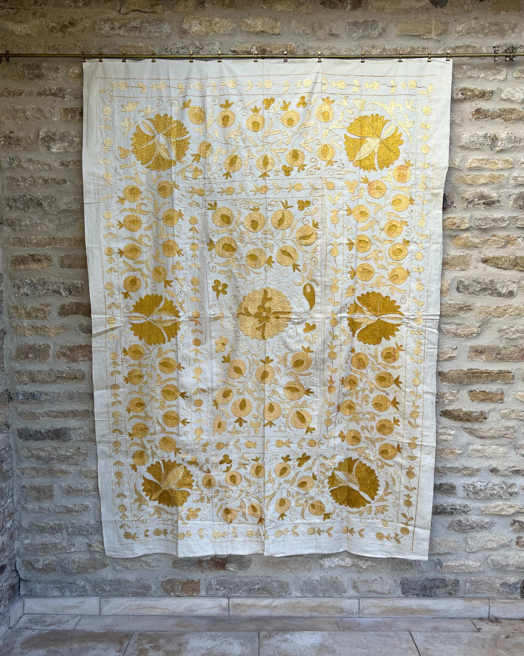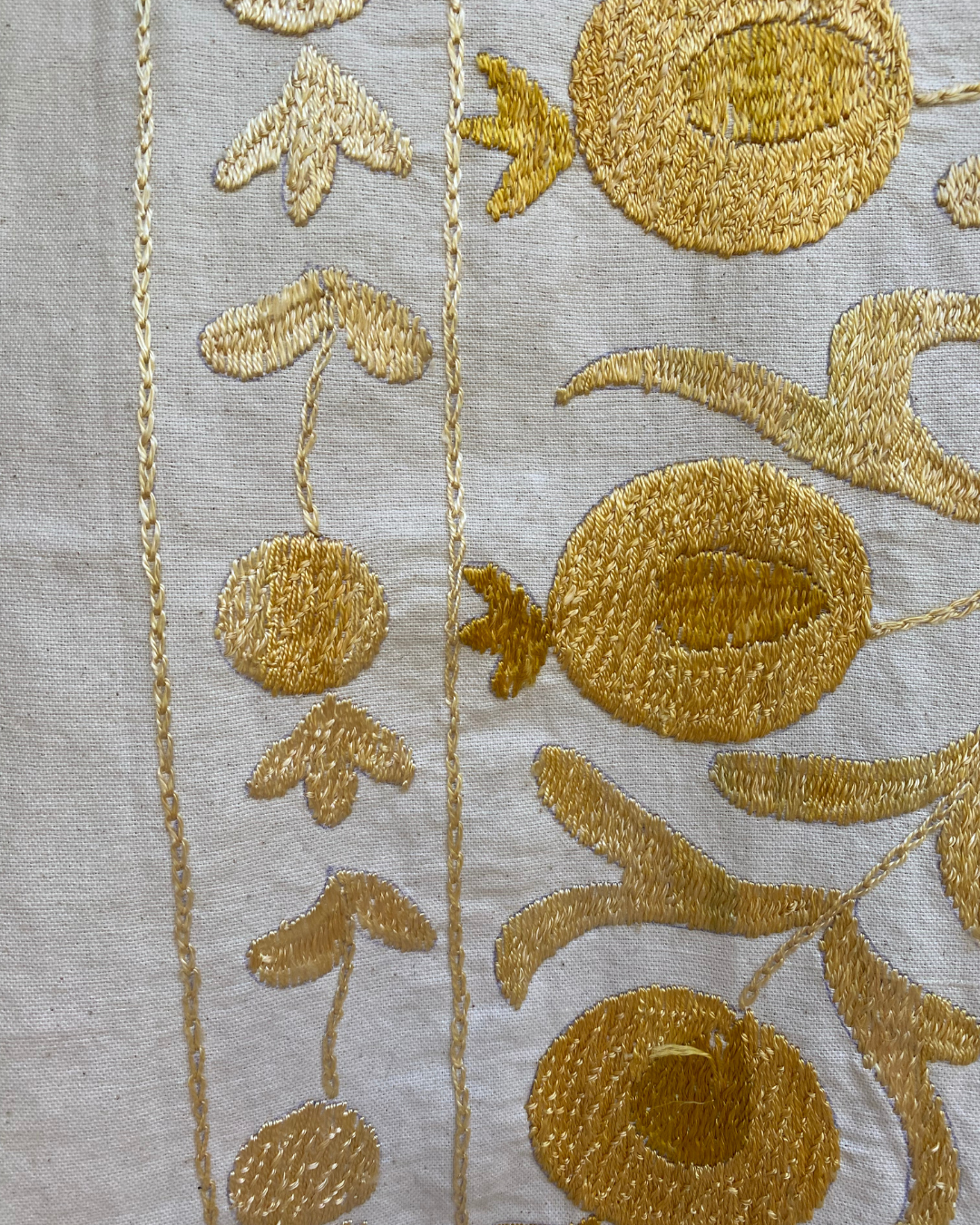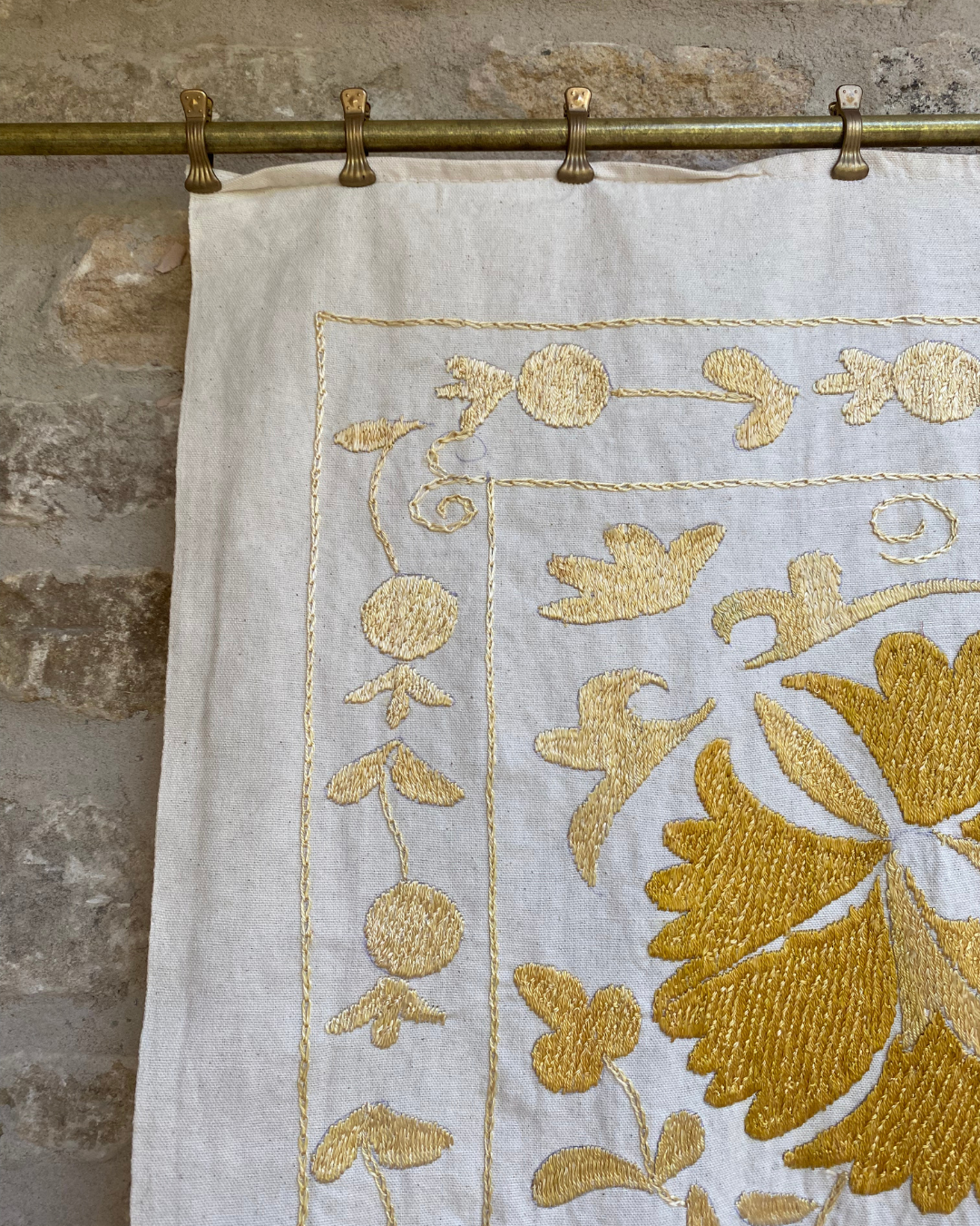 An exquisite hand-embroidered tonal yellow vintage textile panel, that has been chosen by Chloe from Asia. This handmade vintage Suzani, is a true masterpiece that will effortlessly infuse colour and pattern into any interior.