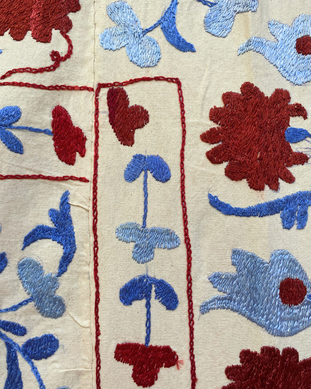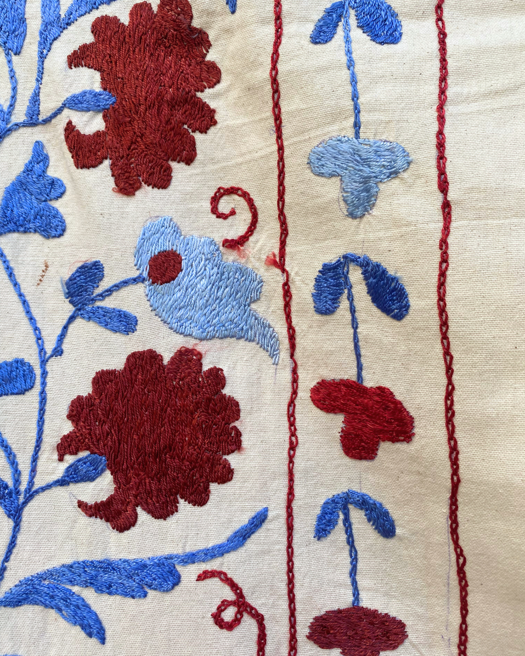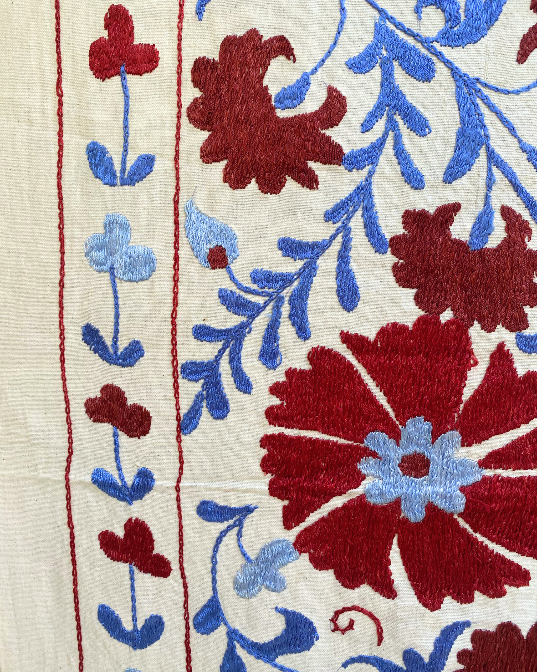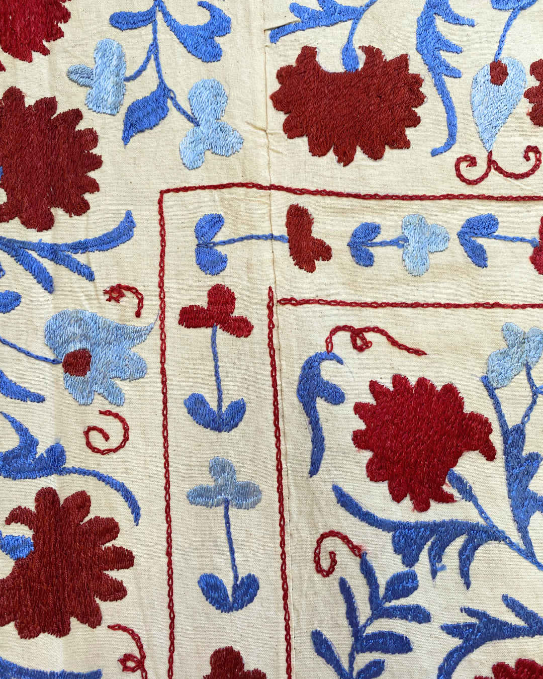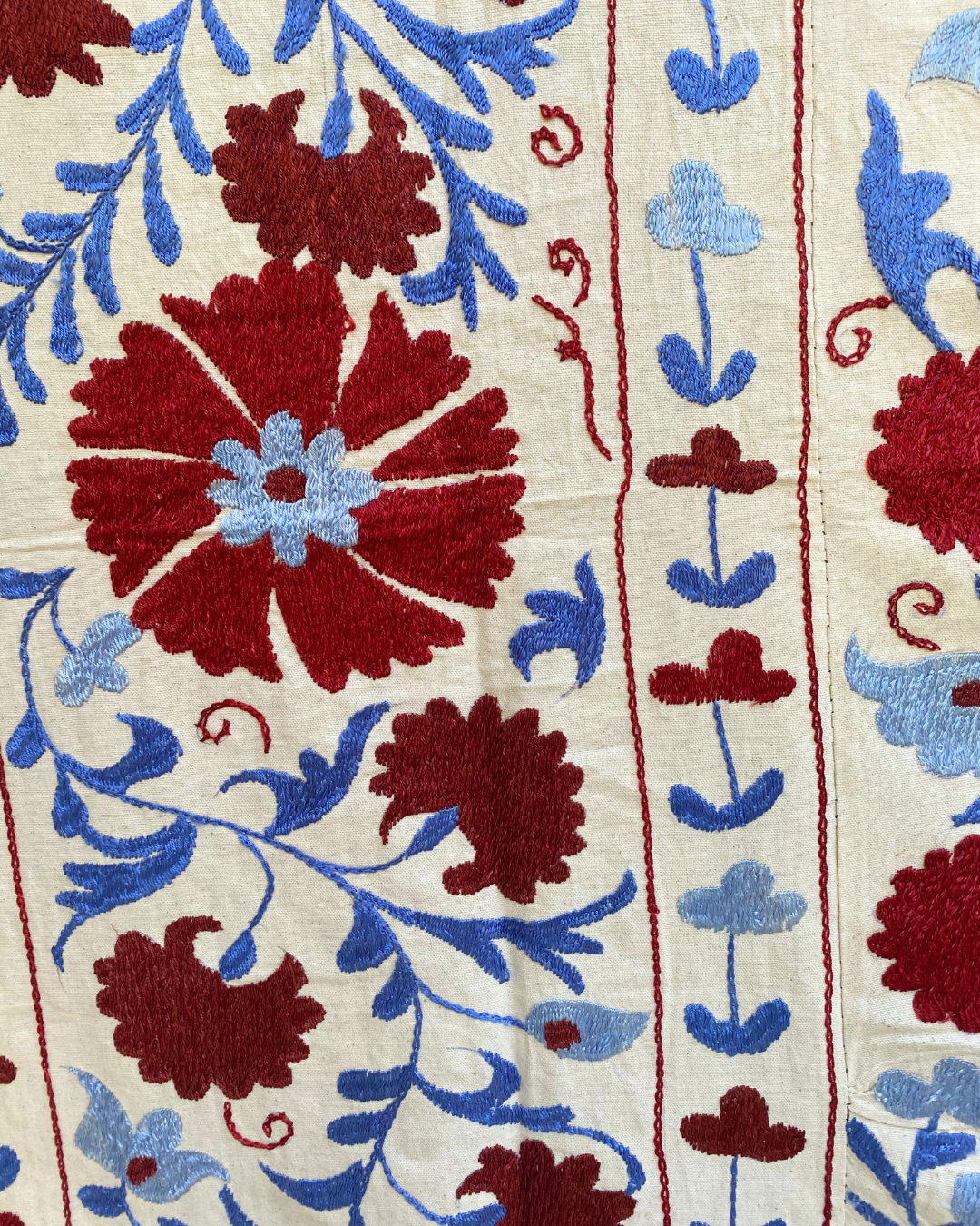 An exquisite hand-embroidered red and blue vintage textile panel, that has been chosen by Chloe from Asia. This handmade vintage Suzani, is a true masterpiece that will effortlessly infuse colour and pattern into any interior.