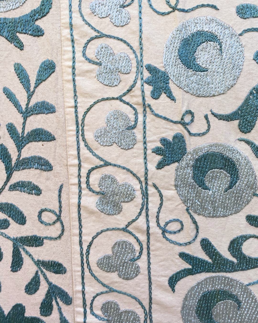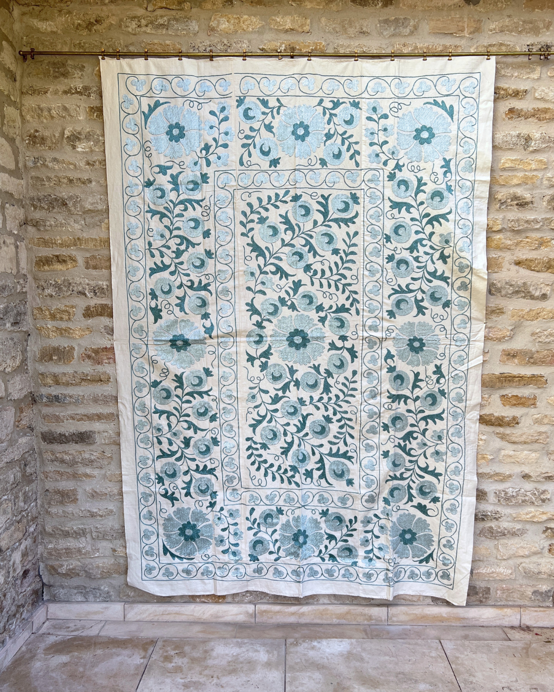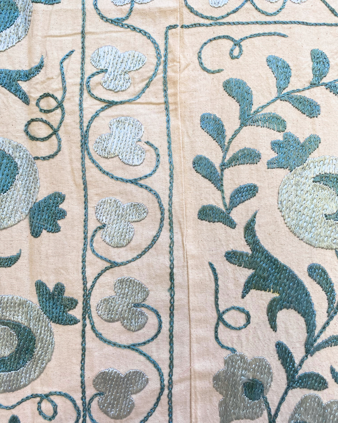An exquisite hand-embroidered tonal teal blue vintage textile panel, that has been chosen by Chloe from Asia. This handmade vintage Suzani, is a true masterpiece that will effortlessly infuse colour and pattern into any interior.