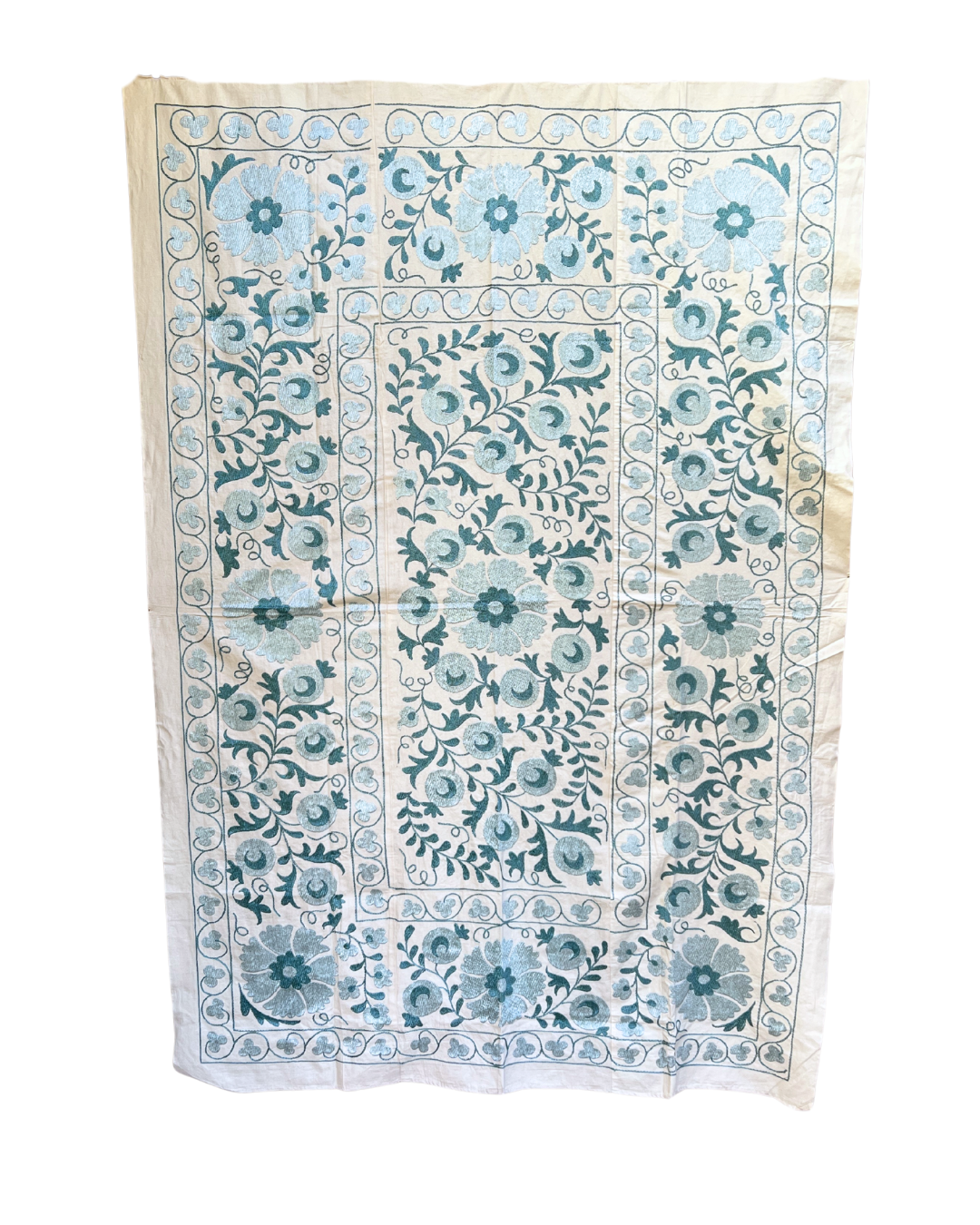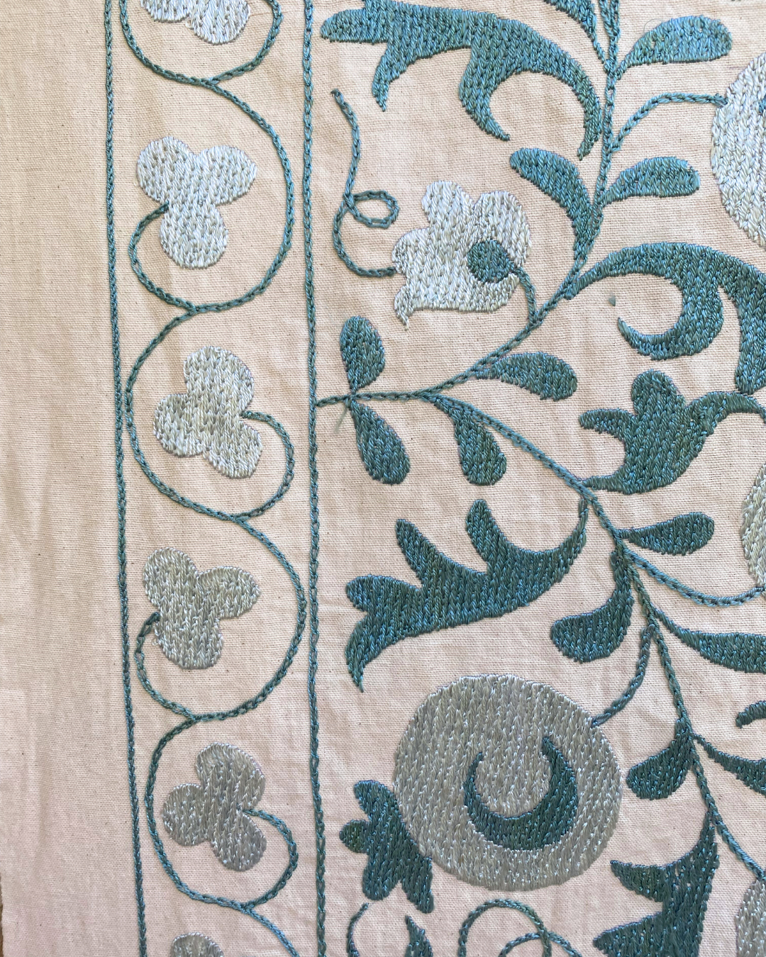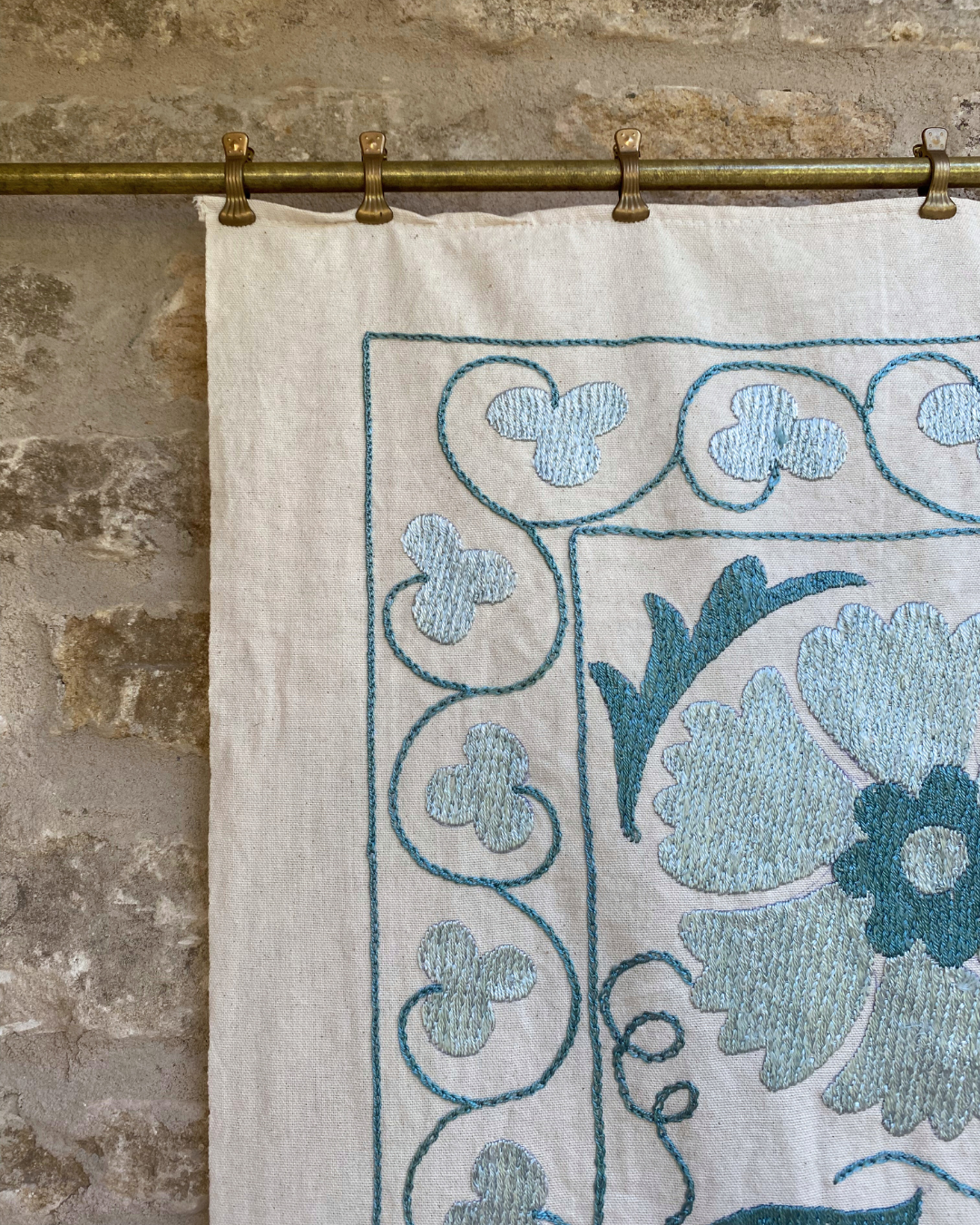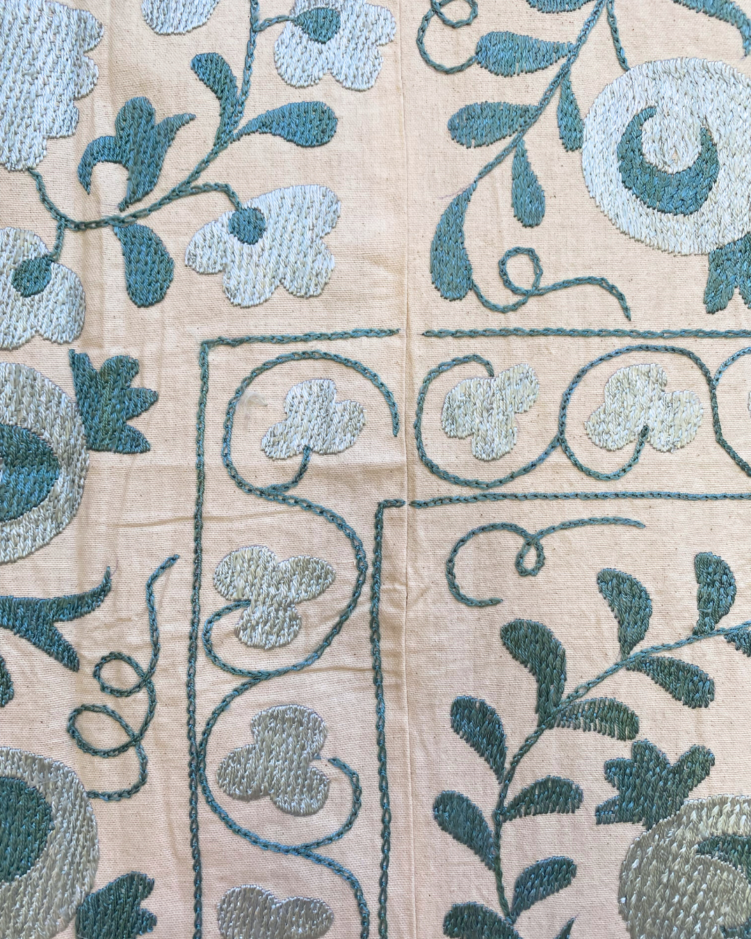 An exquisite hand-embroidered tonal teal blue vintage textile panel, that has been chosen by Chloe from Asia. This handmade vintage Suzani, is a true masterpiece that will effortlessly infuse colour and pattern into any interior.