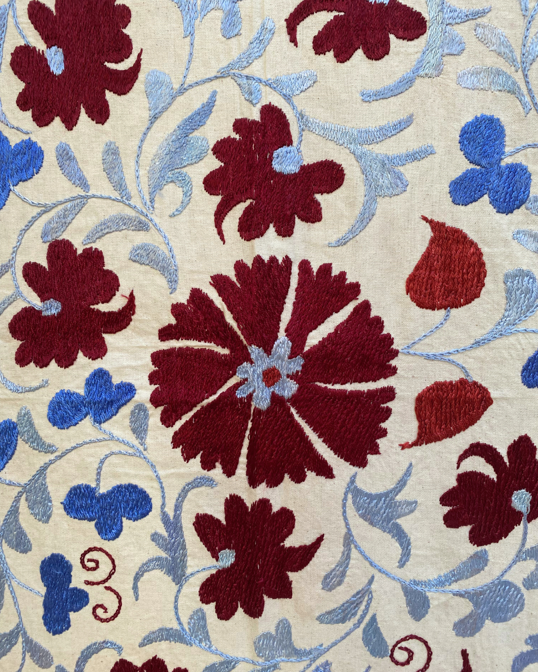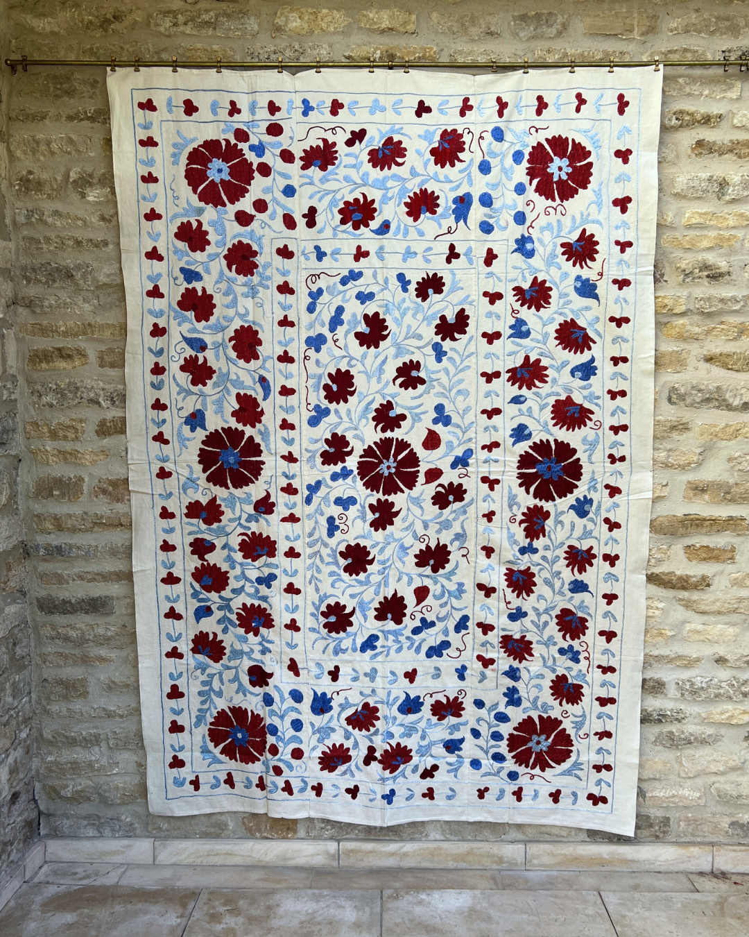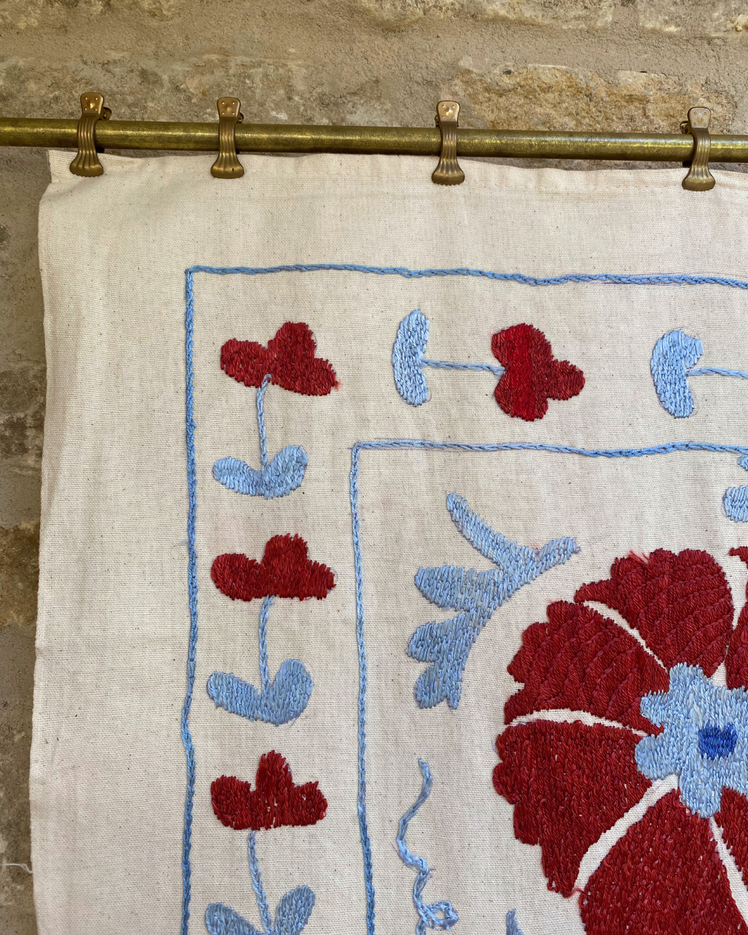 An exquisite hand-embroidered red and tonal blue vintage textile panel, that has been chosen by Chloe from Asia. This handmade vintage Suzani, is a true masterpiece that will effortlessly infuse colour and pattern into any interior.