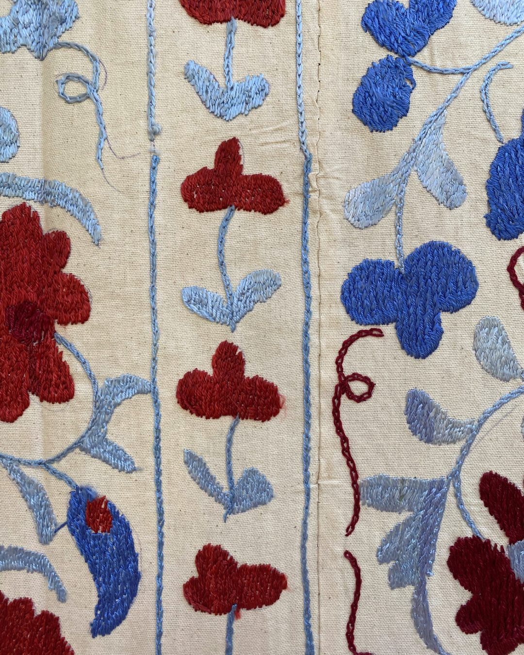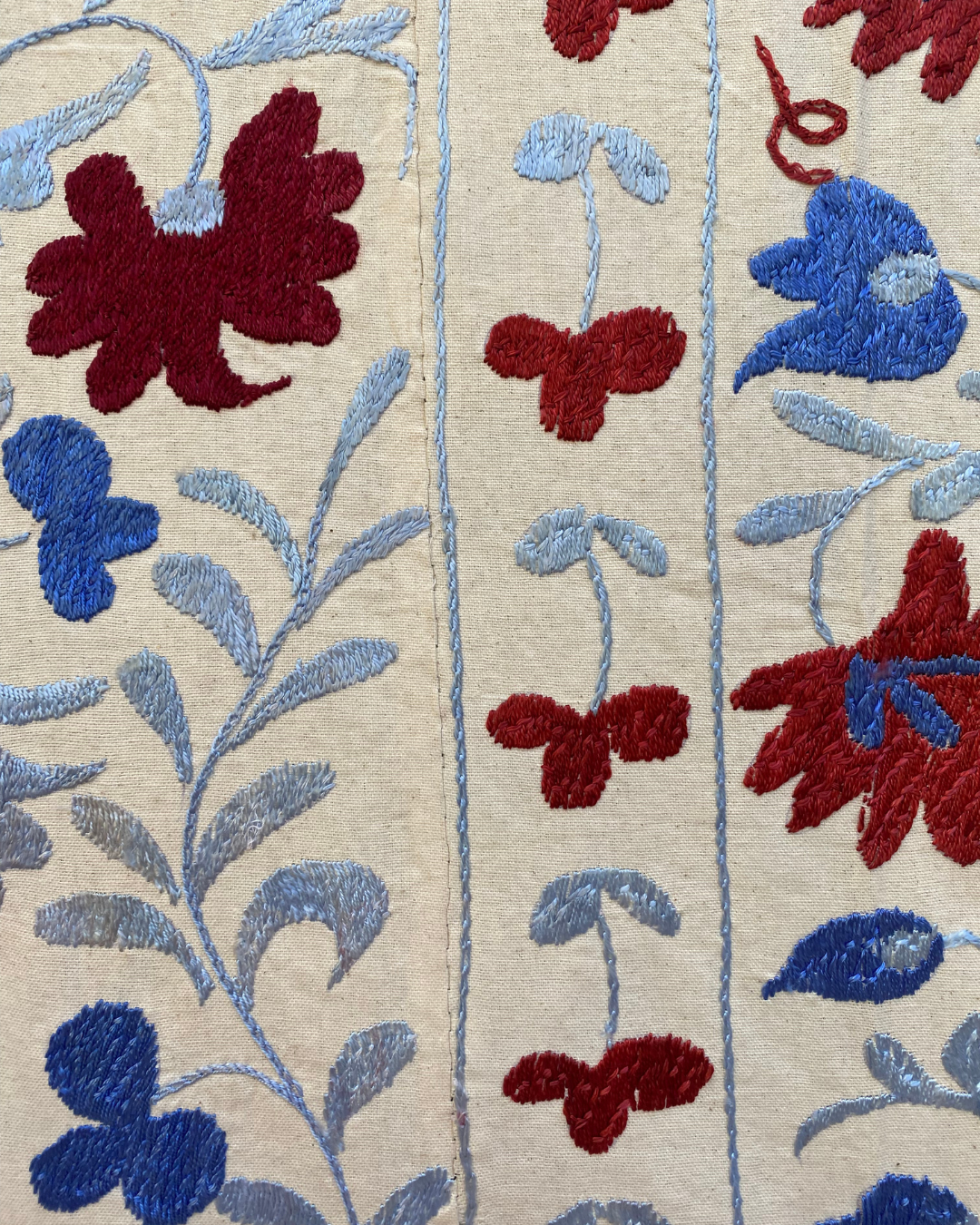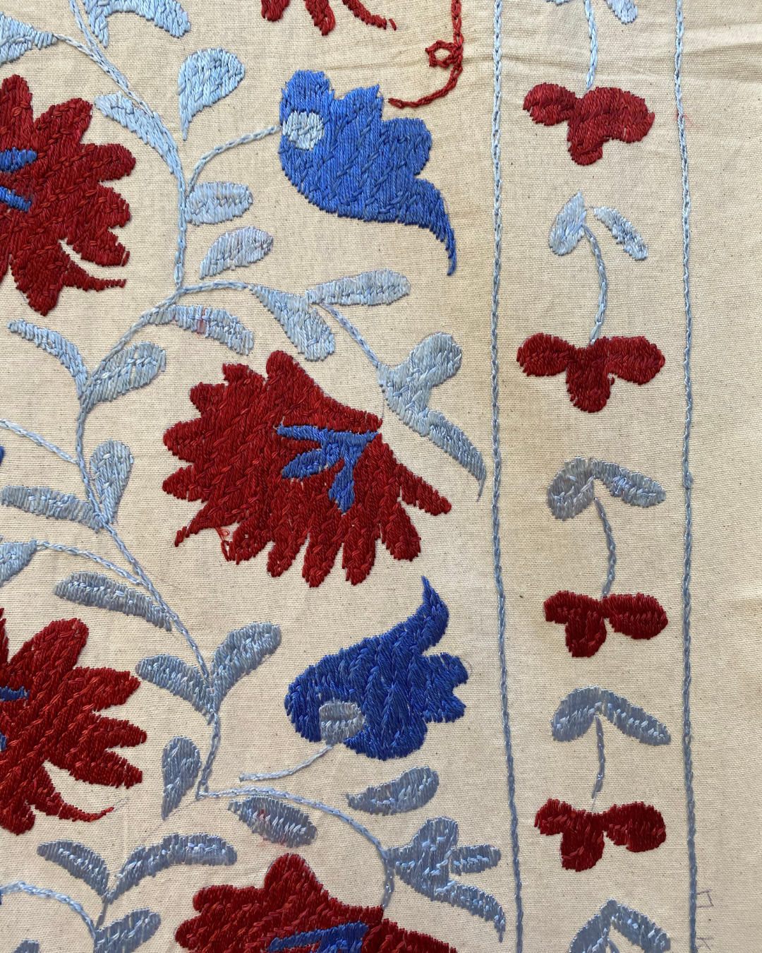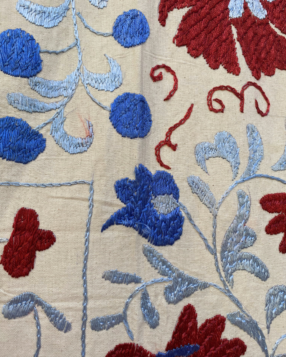 An exquisite hand-embroidered red and tonal blue vintage textile panel, that has been chosen by Chloe from Asia. This handmade vintage Suzani, is a true masterpiece that will effortlessly infuse colour and pattern into any interior.