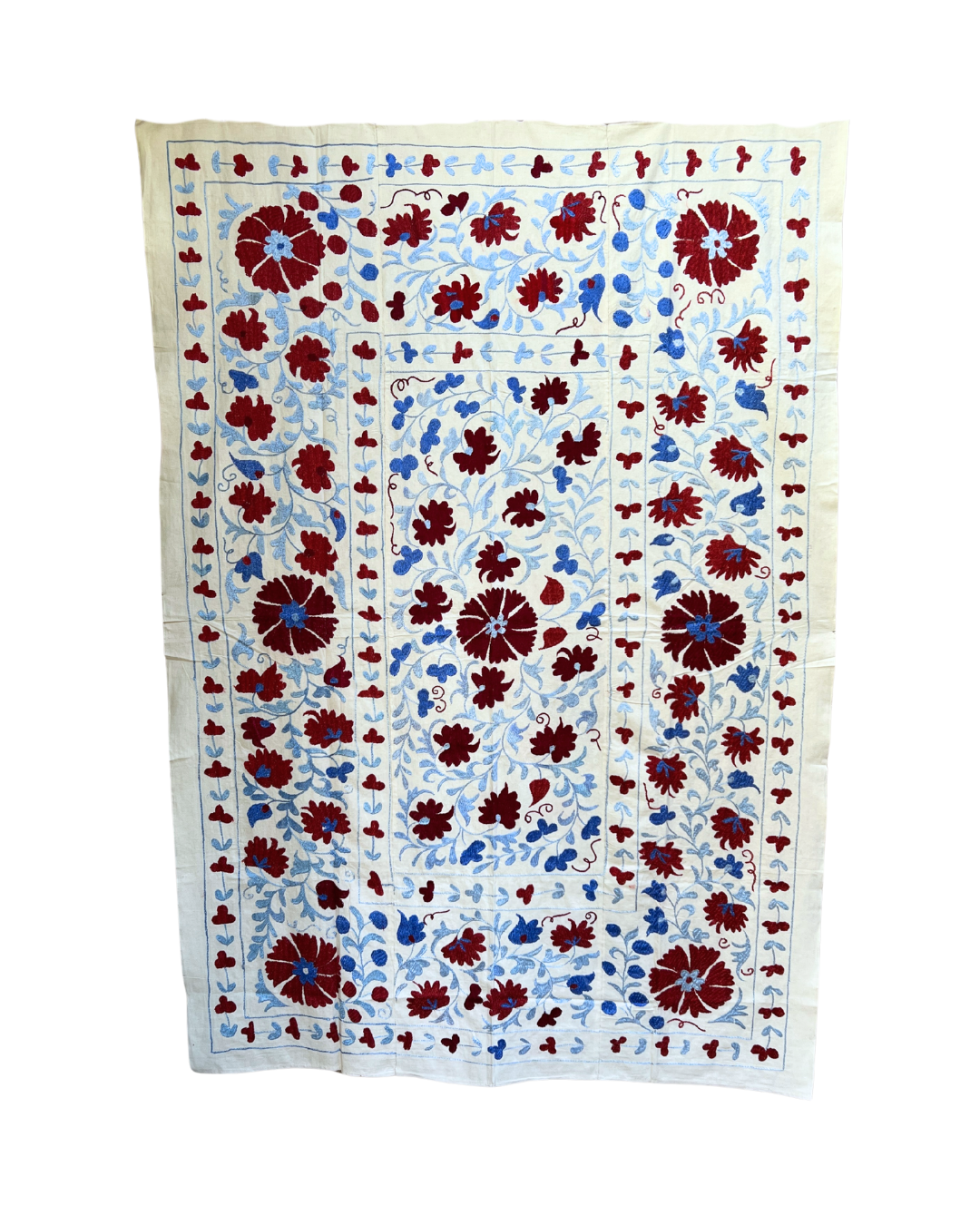 This Suzani has a rich history that is believed to be over 20 years, it is likely to carry endearing marks of time, such imperfections only enhance its unique character and add to its charm.