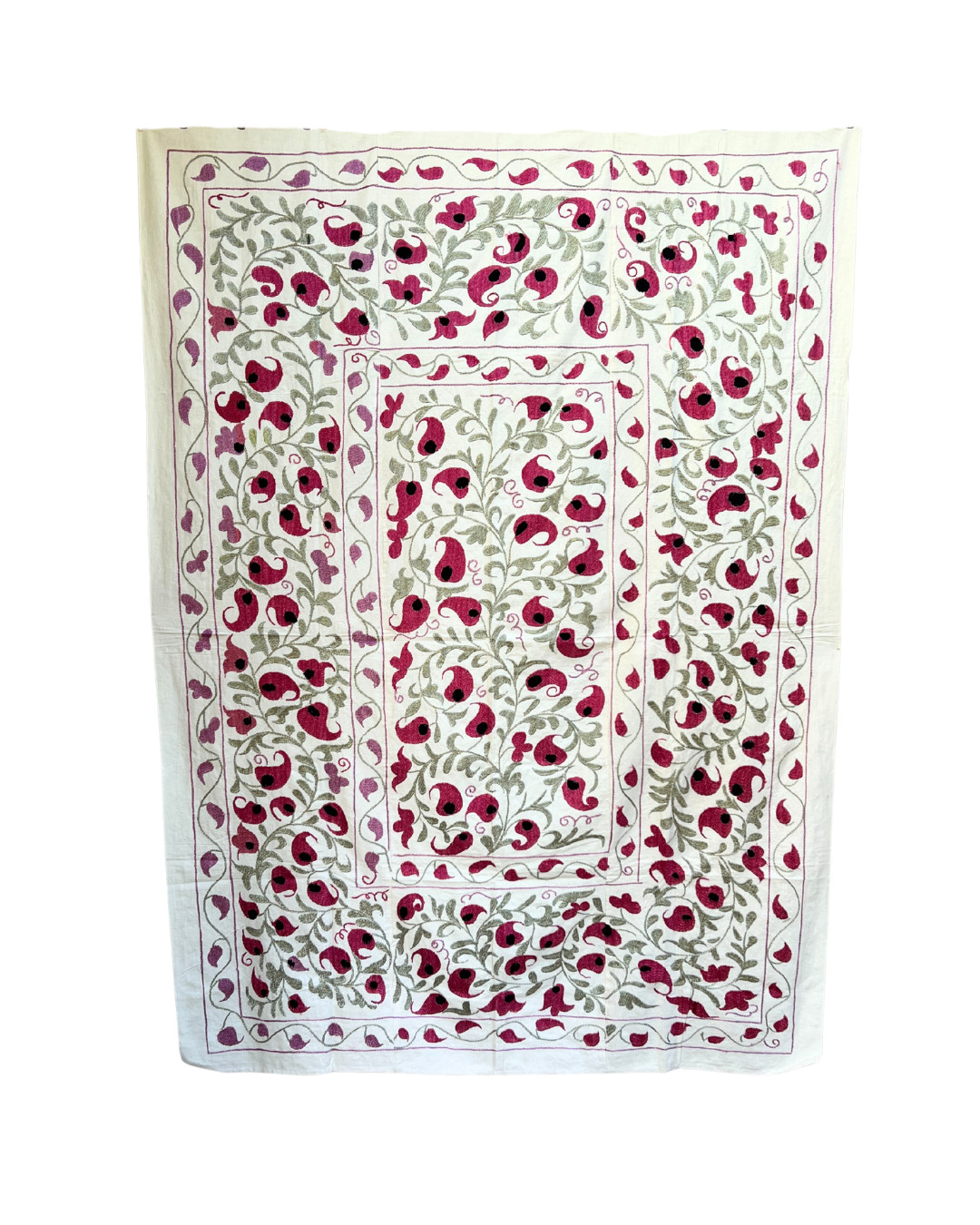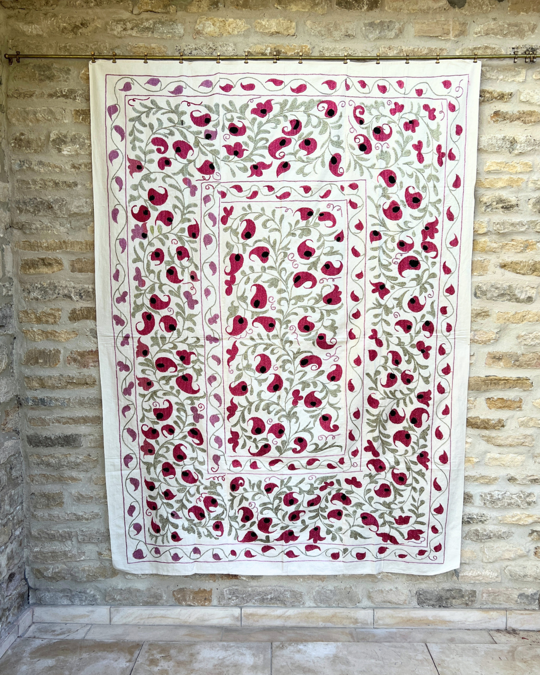 This Suzani has a rich history that is believed to be over 20 years, it is likely to carry endearing marks of time, such imperfections only enhance its unique character and add to its charm.