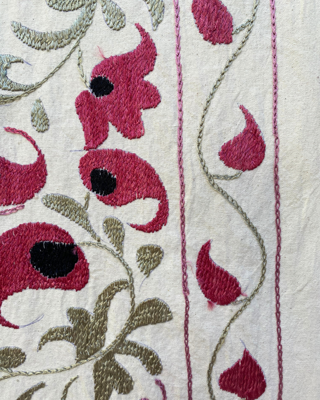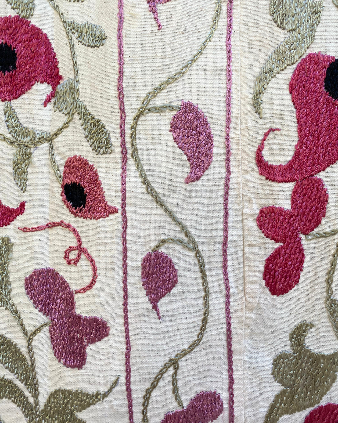 An exquisite hand-embroidered pink, pistachio and black vintage textile panel, that has been chosen by Chloe from Asia. This handmade vintage Suzani, is a true masterpiece that will effortlessly infuse colour and pattern into any interior.