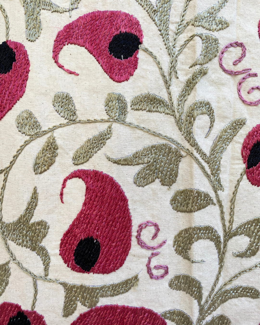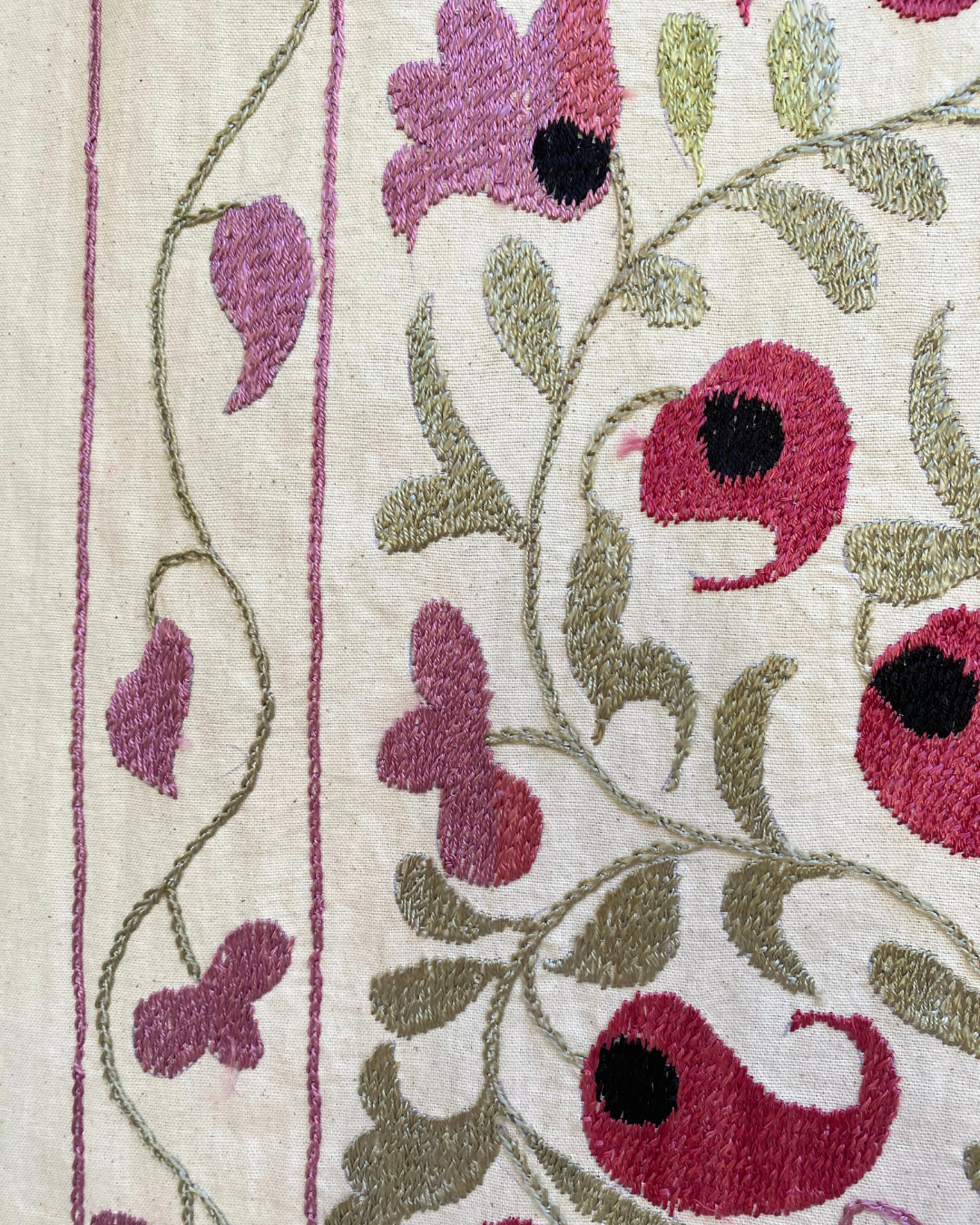 Pink, pistachio and black embroidery on a neutral background background