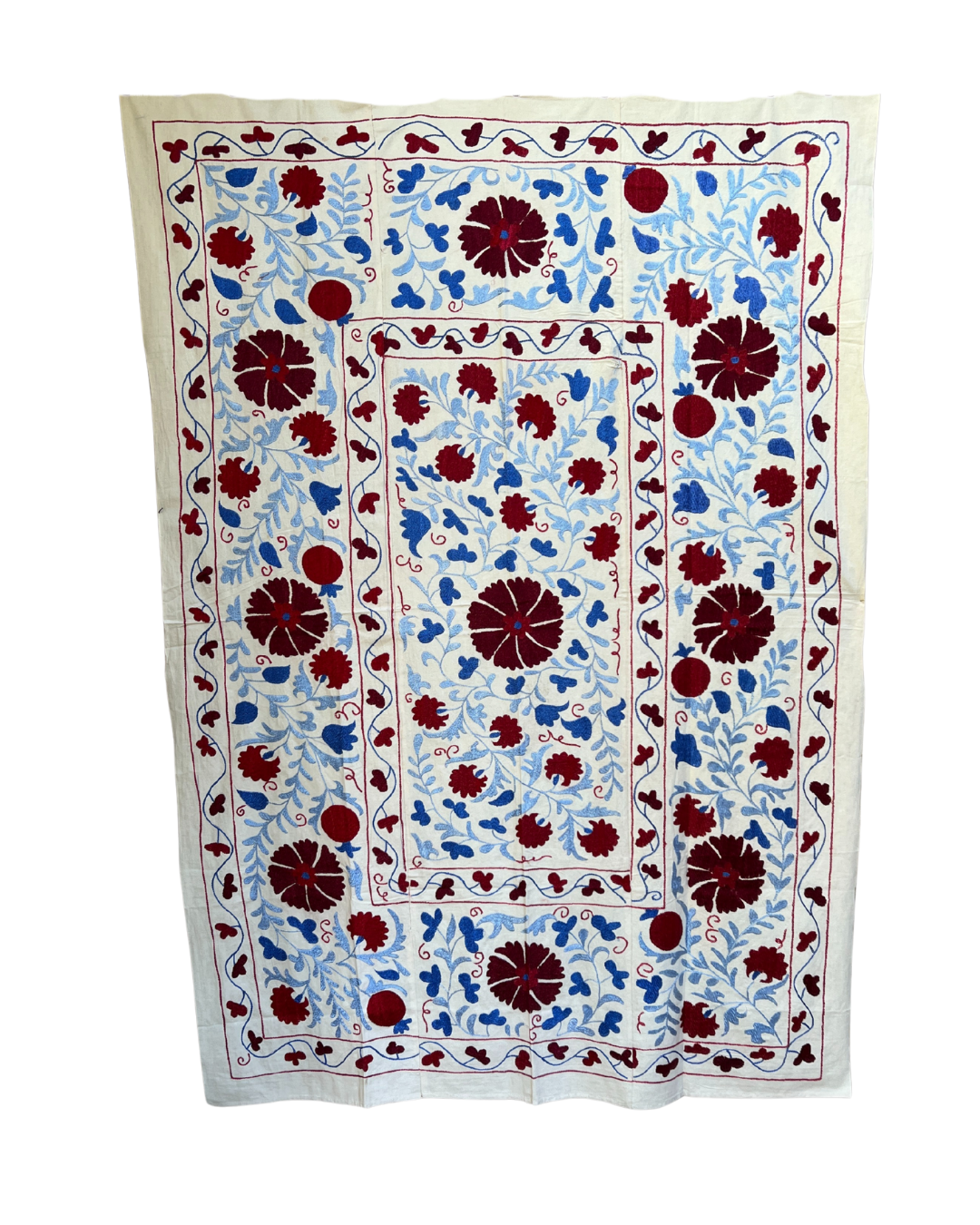 This Suzani has a rich history that is believed to be over 20 years, it is likely to carry endearing marks of time, such imperfections only enhance its unique character and add to its charm.