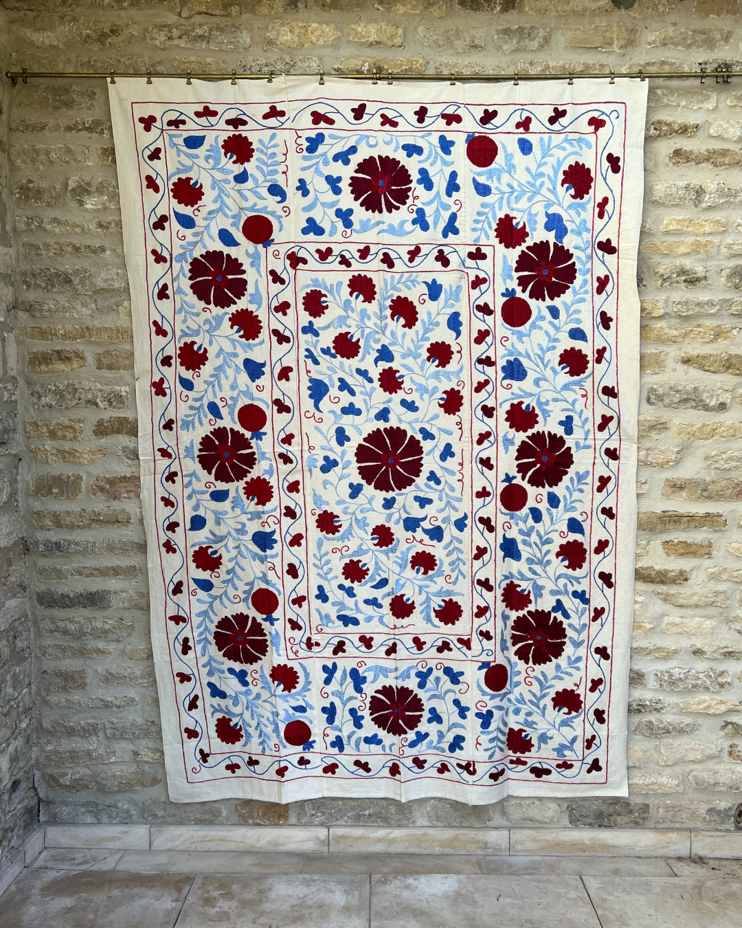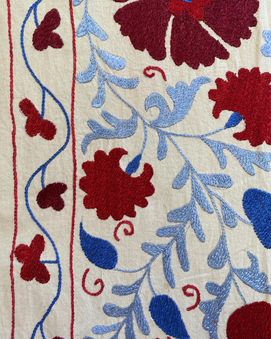 An exquisite hand-embroidered maroon, red and blue vintage textile panel, that has been chosen by Chloe from Asia. This handmade vintage Suzani, is a true masterpiece that will effortlessly infuse colour and pattern into any interior.