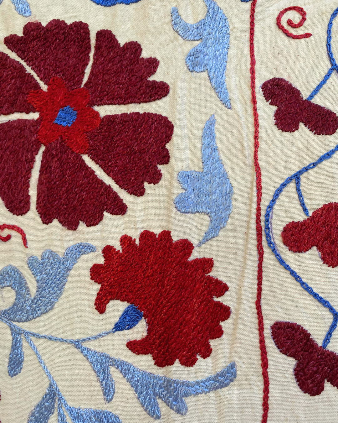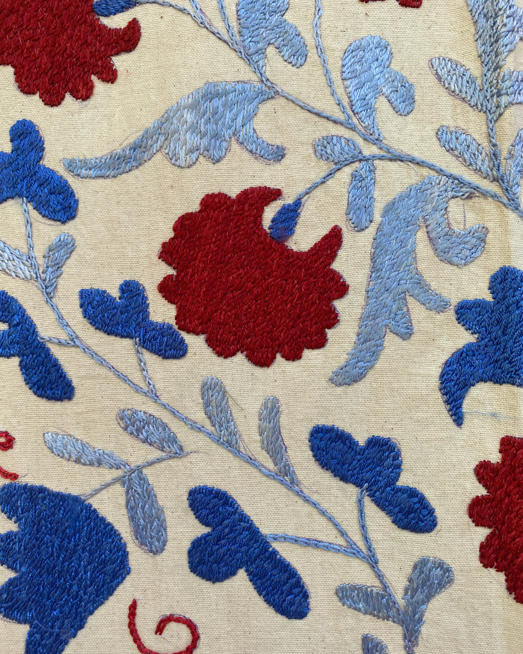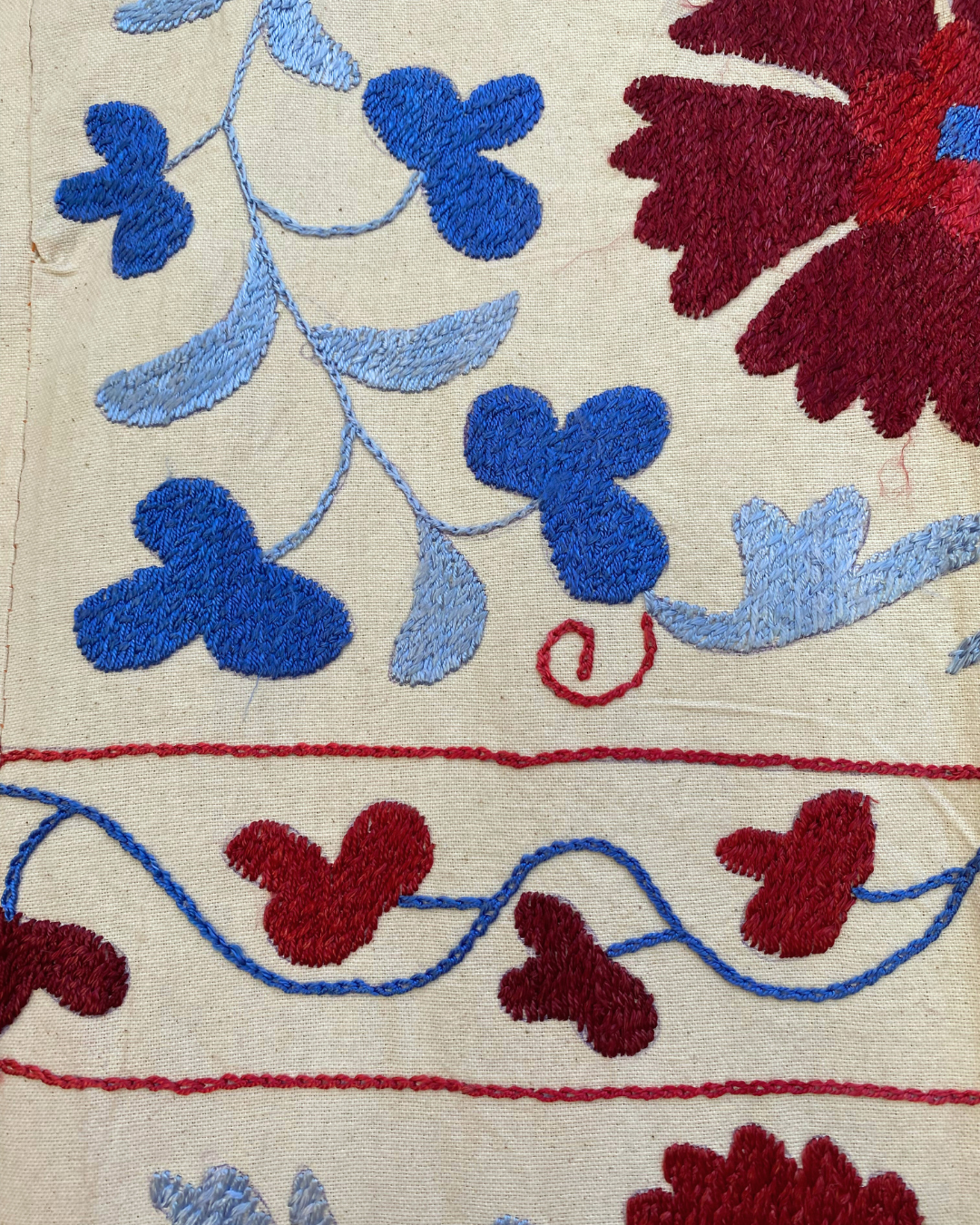 Maroon, red and tonal blue embroidery on a neutral background background