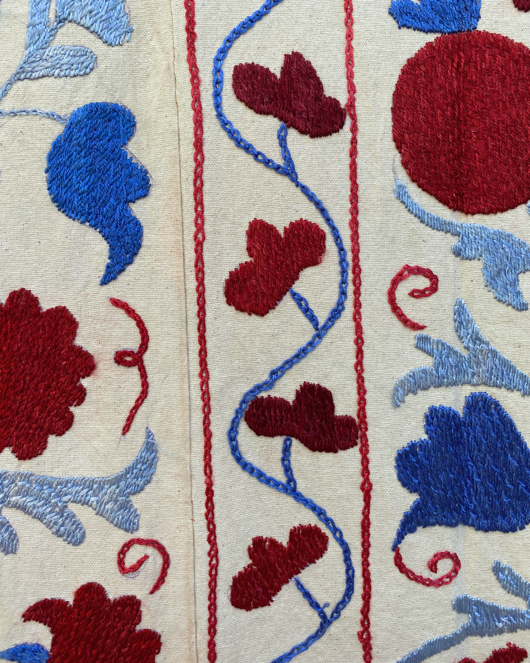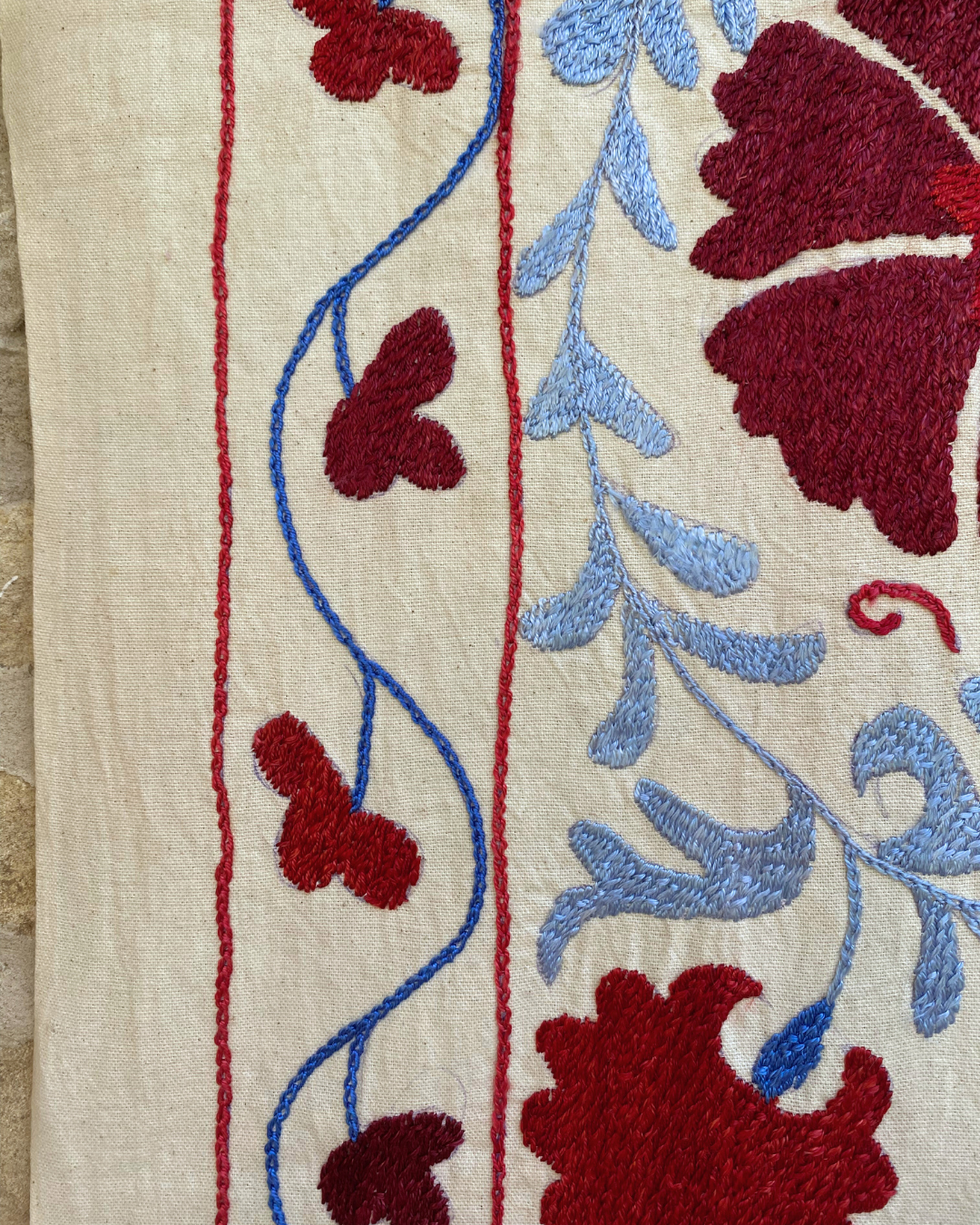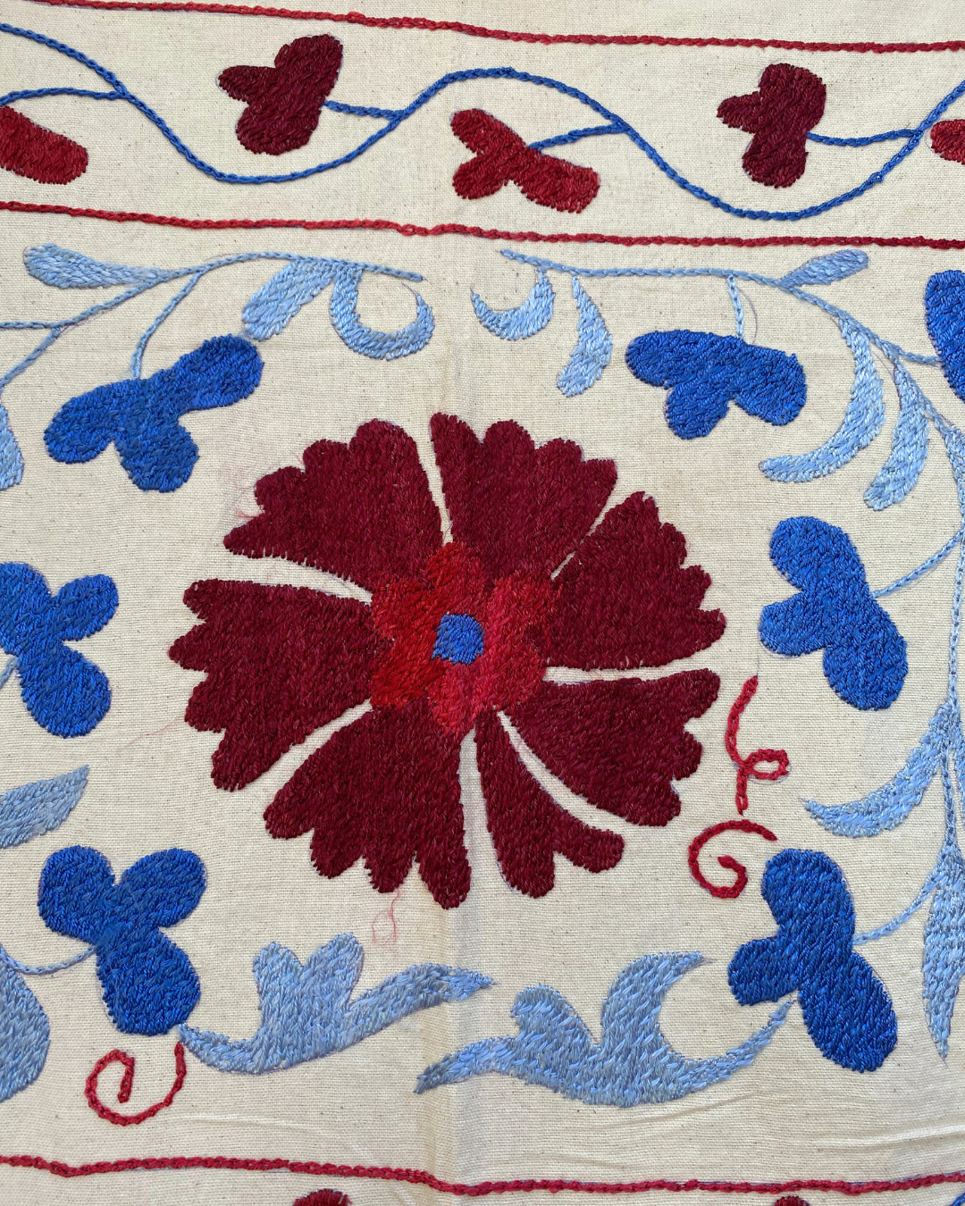 Maroon, red and tonal blue embroidery on a neutral background background