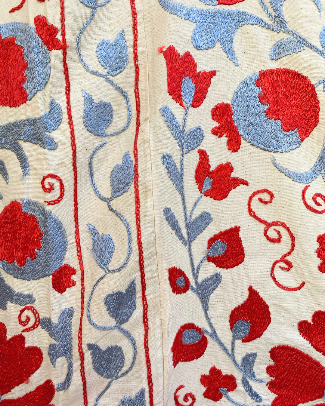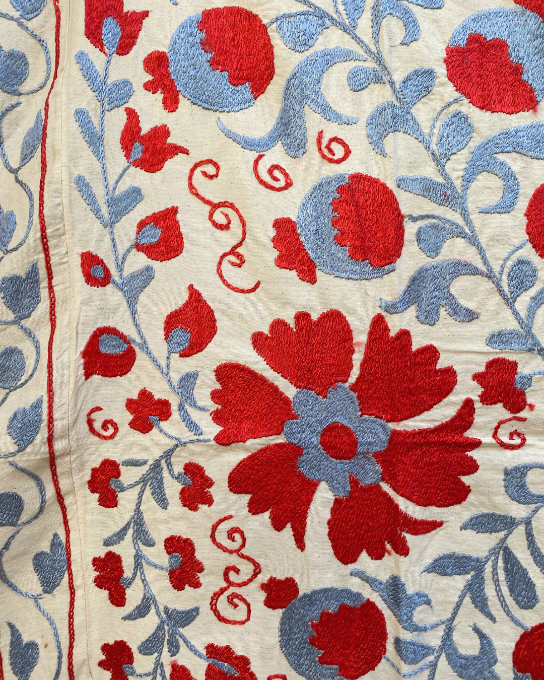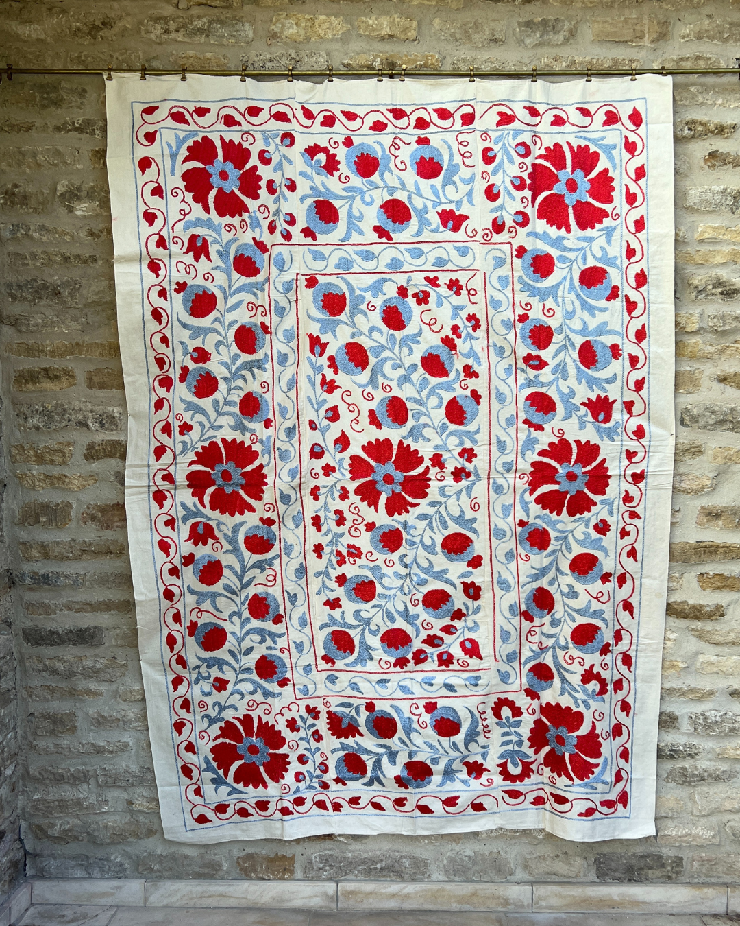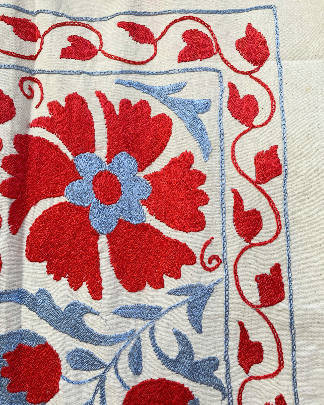 An exquisite hand-embroidered bright red and light blue vintage textile panel, that has been chosen by Chloe from Asia. This handmade vintage Suzani, is a true masterpiece that will effortlessly infuse colour and pattern into any interior.