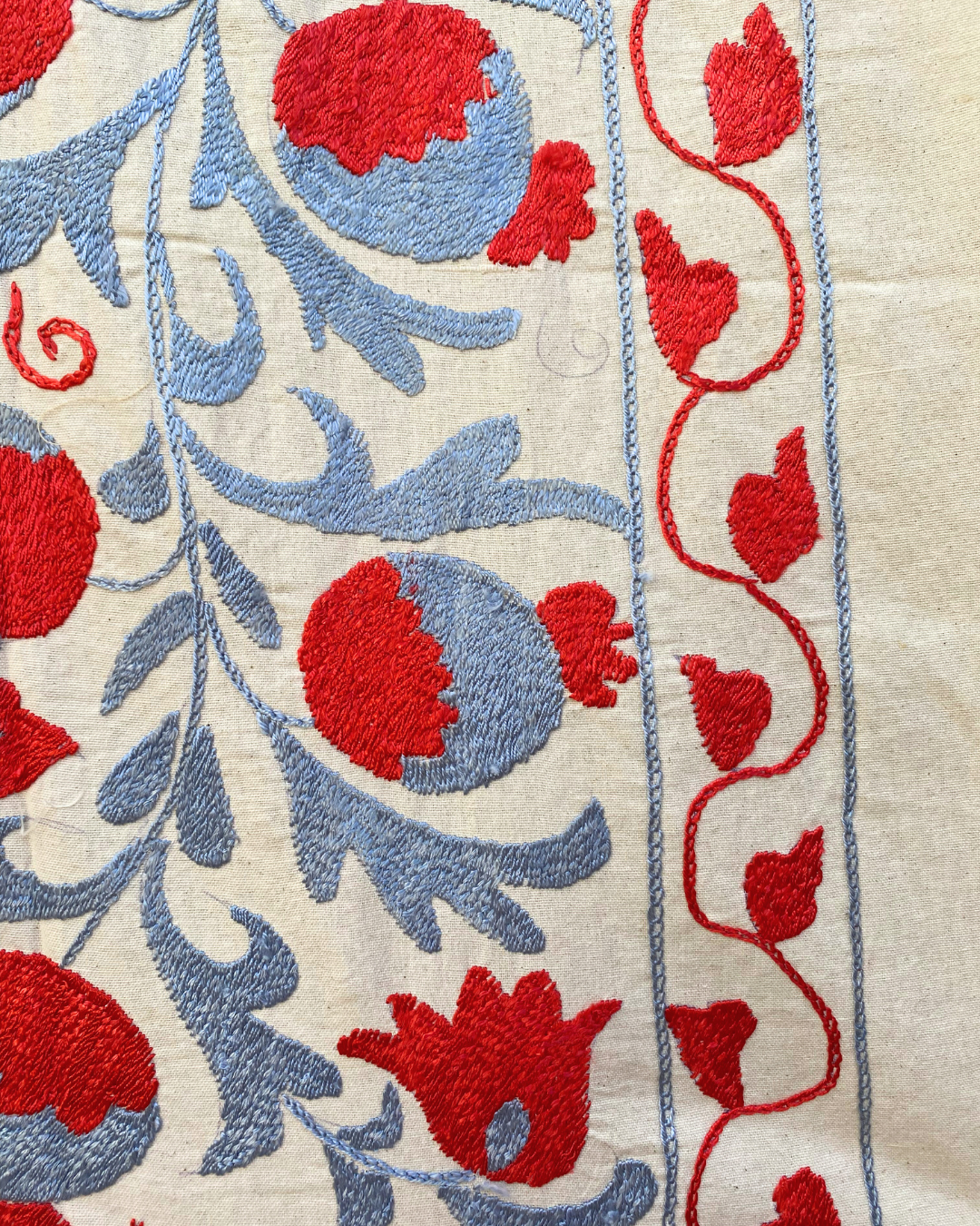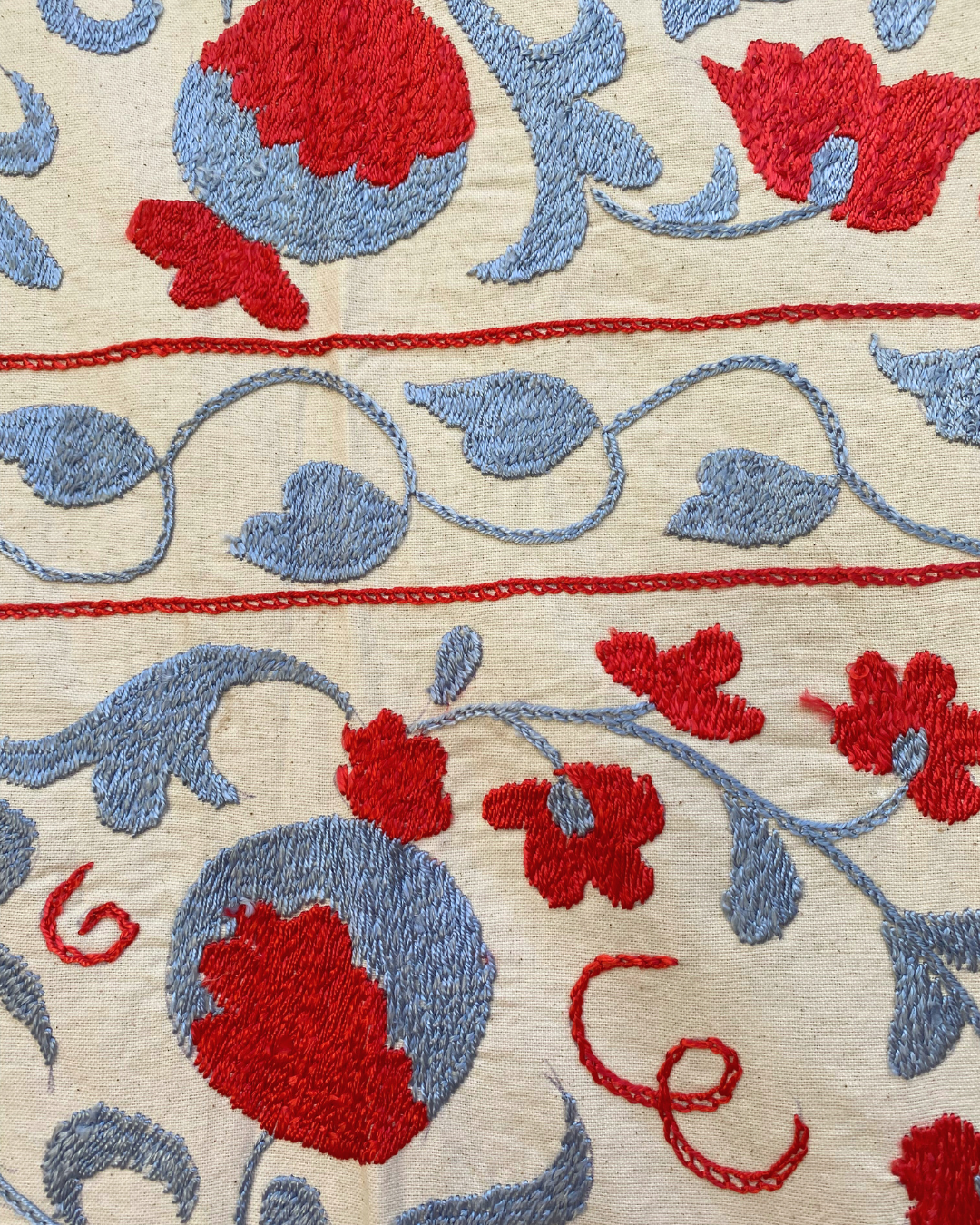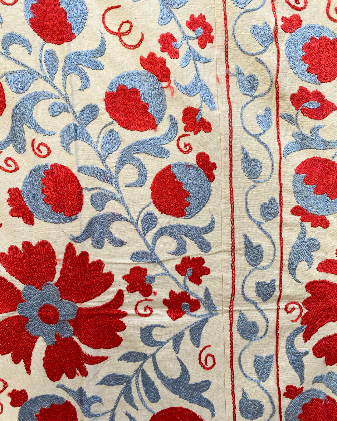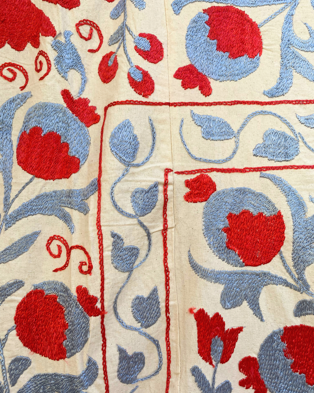 An exquisite hand-embroidered bright red and light blue vintage textile panel, that has been chosen by Chloe from Asia. This handmade vintage Suzani, is a true masterpiece that will effortlessly infuse colour and pattern into any interior.