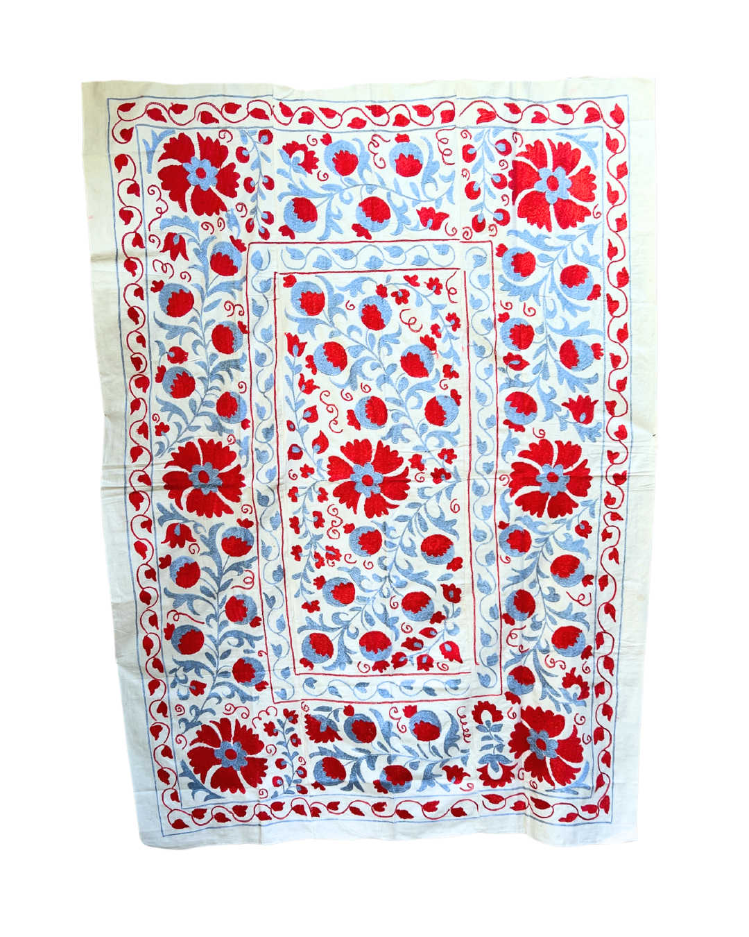 This Suzani has a rich history that is believed to be over 20 years, it is likely to carry endearing marks of time, such imperfections only enhance its unique character and add to its charm.