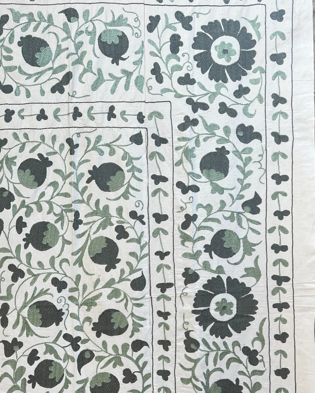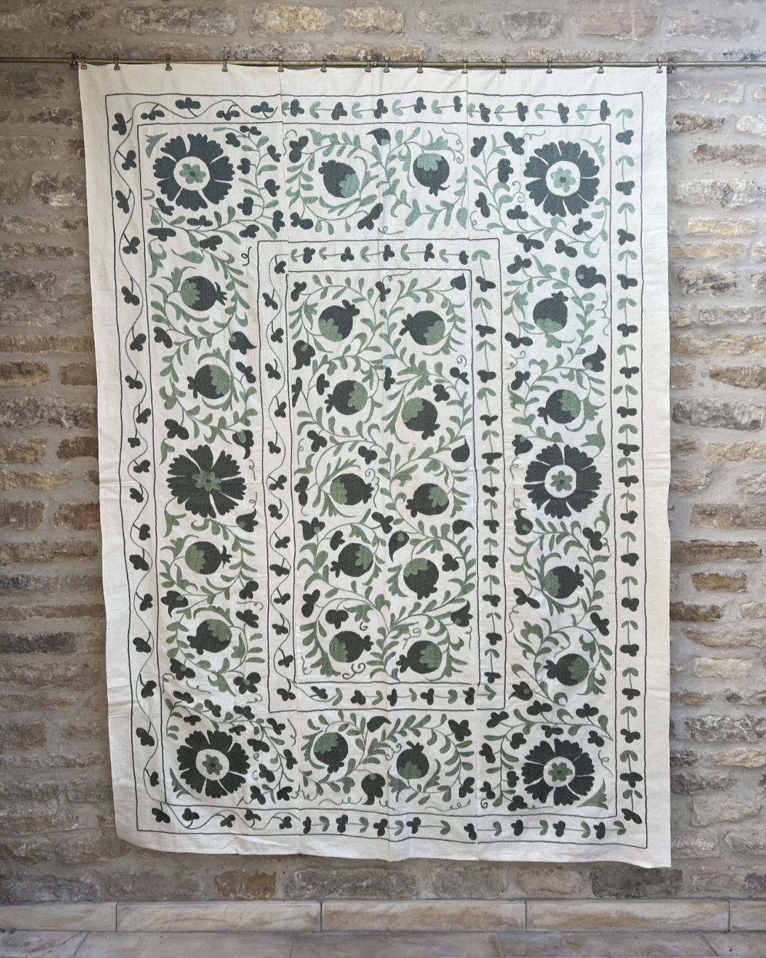 An exquisite hand-embroidered tonal green vintage textile panel, that has been chosen by Chloe from Asia. This handmade vintage Suzani, is a true masterpiece that will effortlessly infuse colour and pattern into any interior.